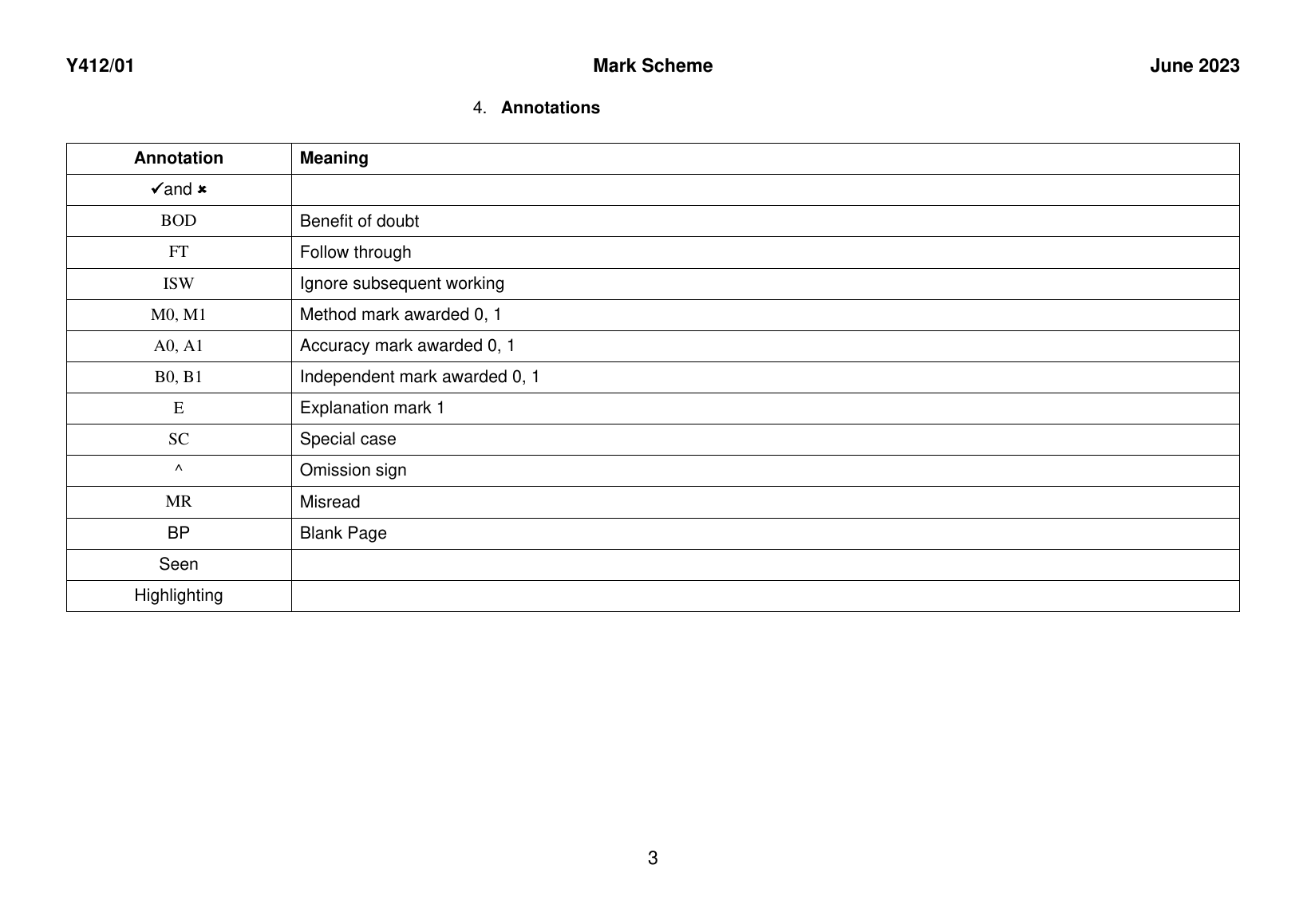 OCR GCE AS LEVEL FURTHER MATHEMATICS B PAPER 1 MARK SCHEME 2023 (Y412/01: Statistics A)