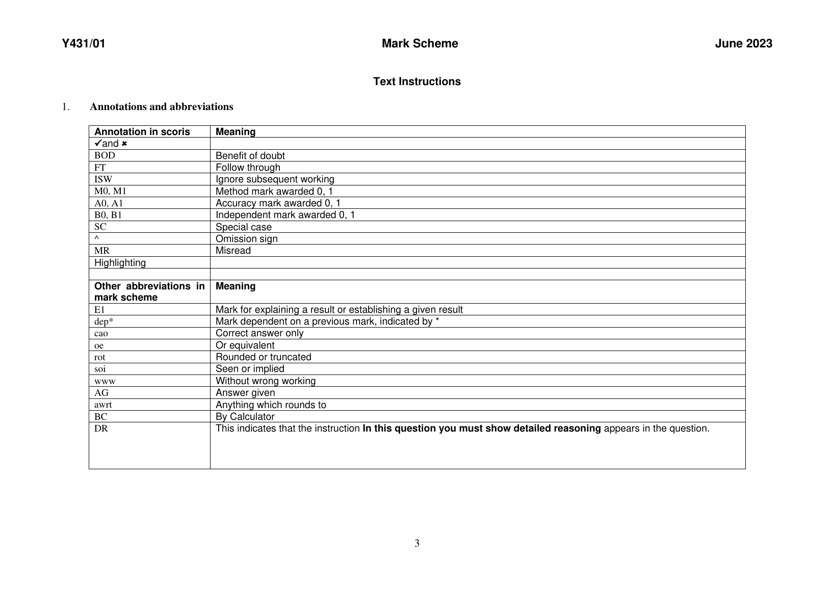 OCR GCE A LEVEL FURTHER MATHEMATICS B PAPER 1 MARK SCHEME 2023 (Y431/01: Mechanics Minor)