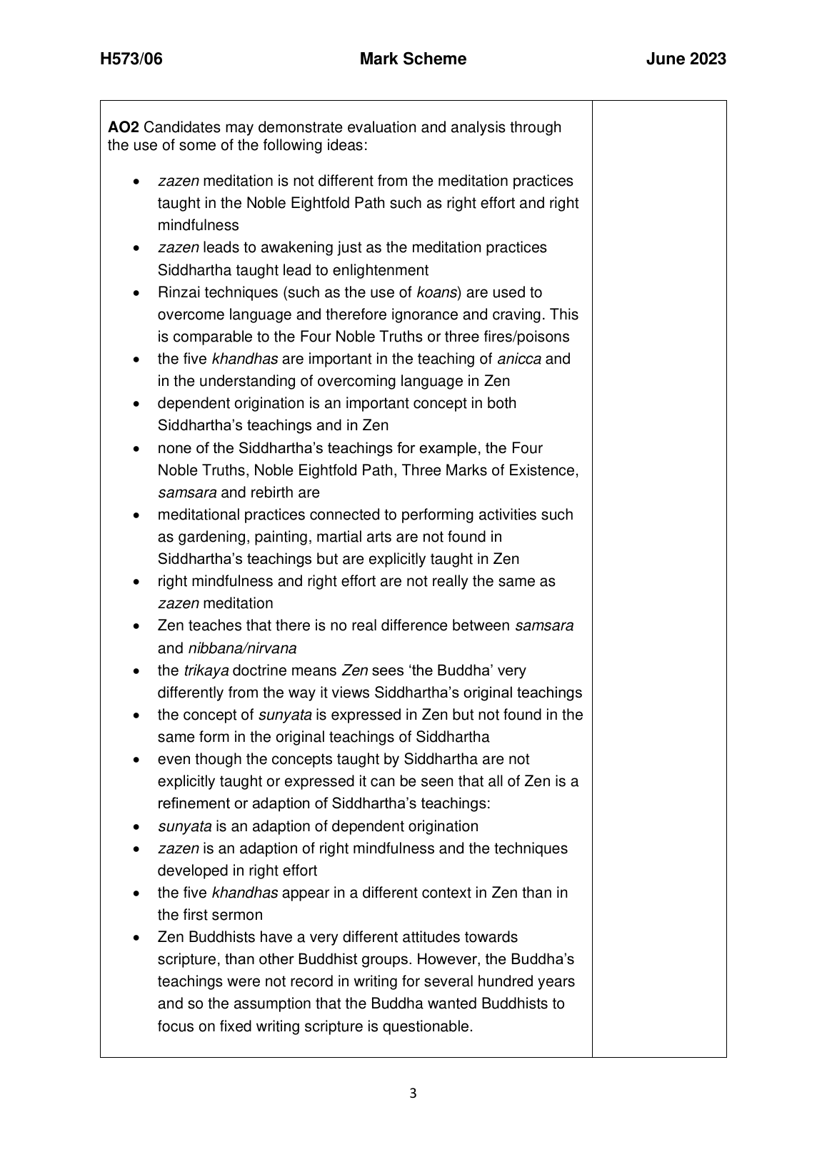 OCR GCE A LEVEL RELIGIOUS STUDIES PAPER 6 MARK SCHEME 2023 (H573/06: Developments in Buddhist thought)