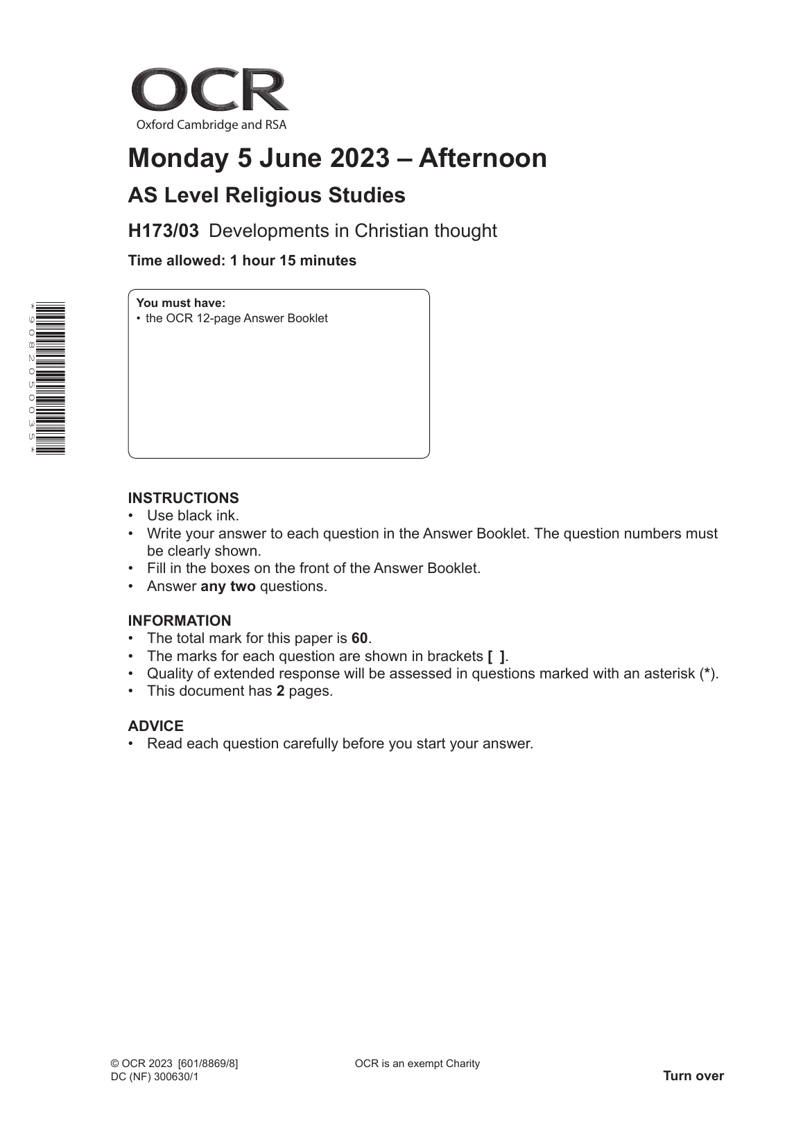 OCR GCE AS LEVEL RELIGIOUS STUDIES PAPER 3 QUESTION PAPER 2023 (H173/03: Developments in Christian thought). DOWNLOAD OFFICIAL AND VERIFIED OCR AS LEVEL RELIGIOUS STUDIES PAPER 3 QUESTION PAPER 2023 ON www.leakedexams.com.