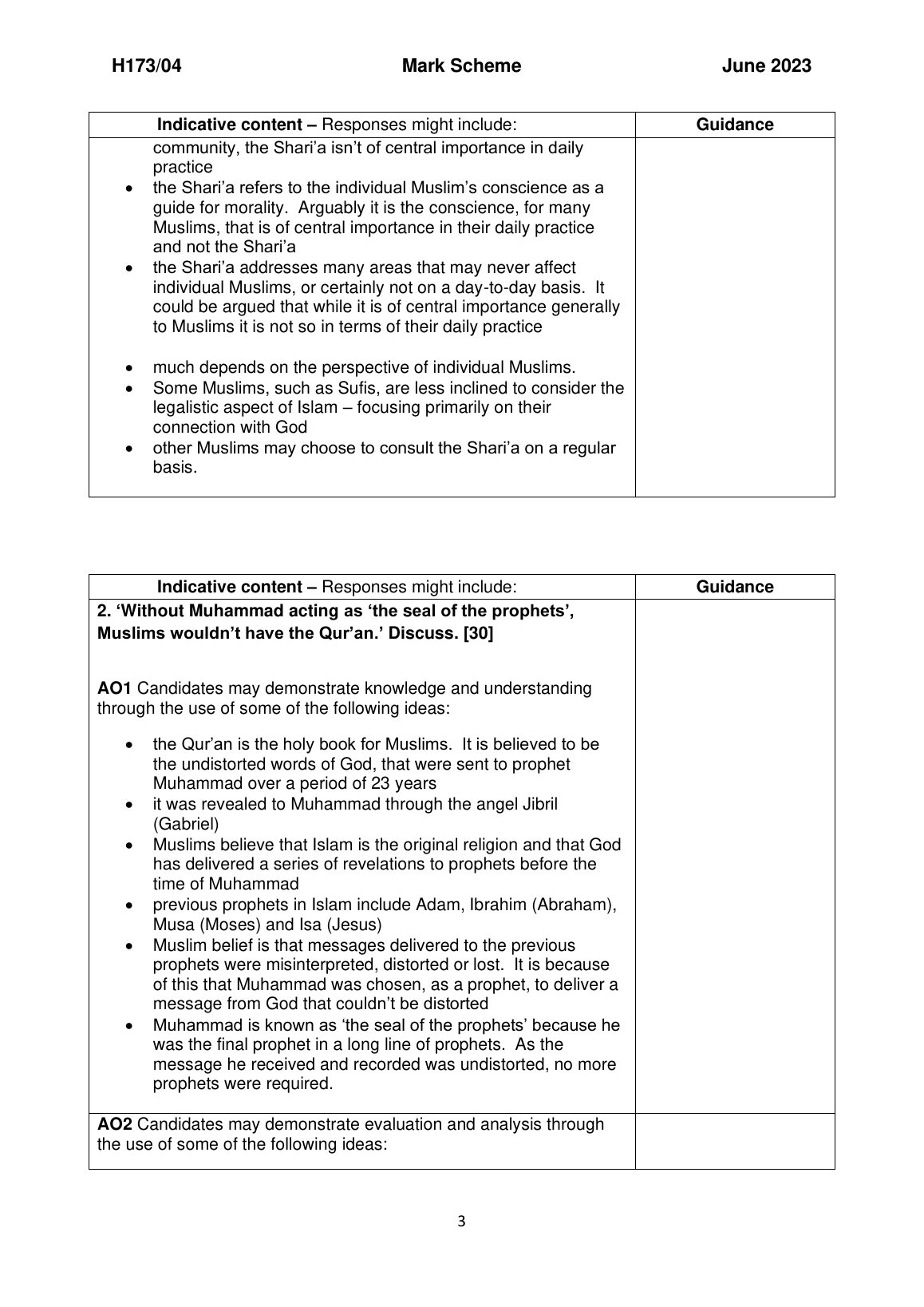 OCR GCE AS LEVEL RELIGIOUS STUDIES PAPER 4 MARK SCHEME 2023 (H173/04: Developments in Islamic thought)