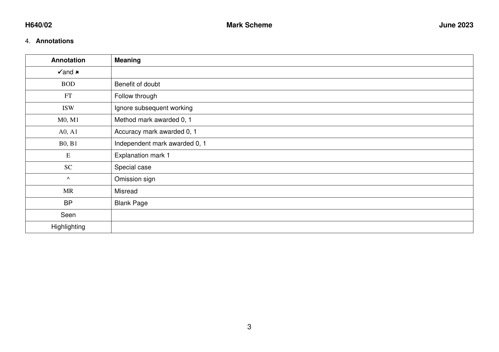 OCR GCE A LEVEL MATHEMATICS B PAPER 2 MARK SCHEME 2023 (H640/02: Pure Mathematics and Statistics)