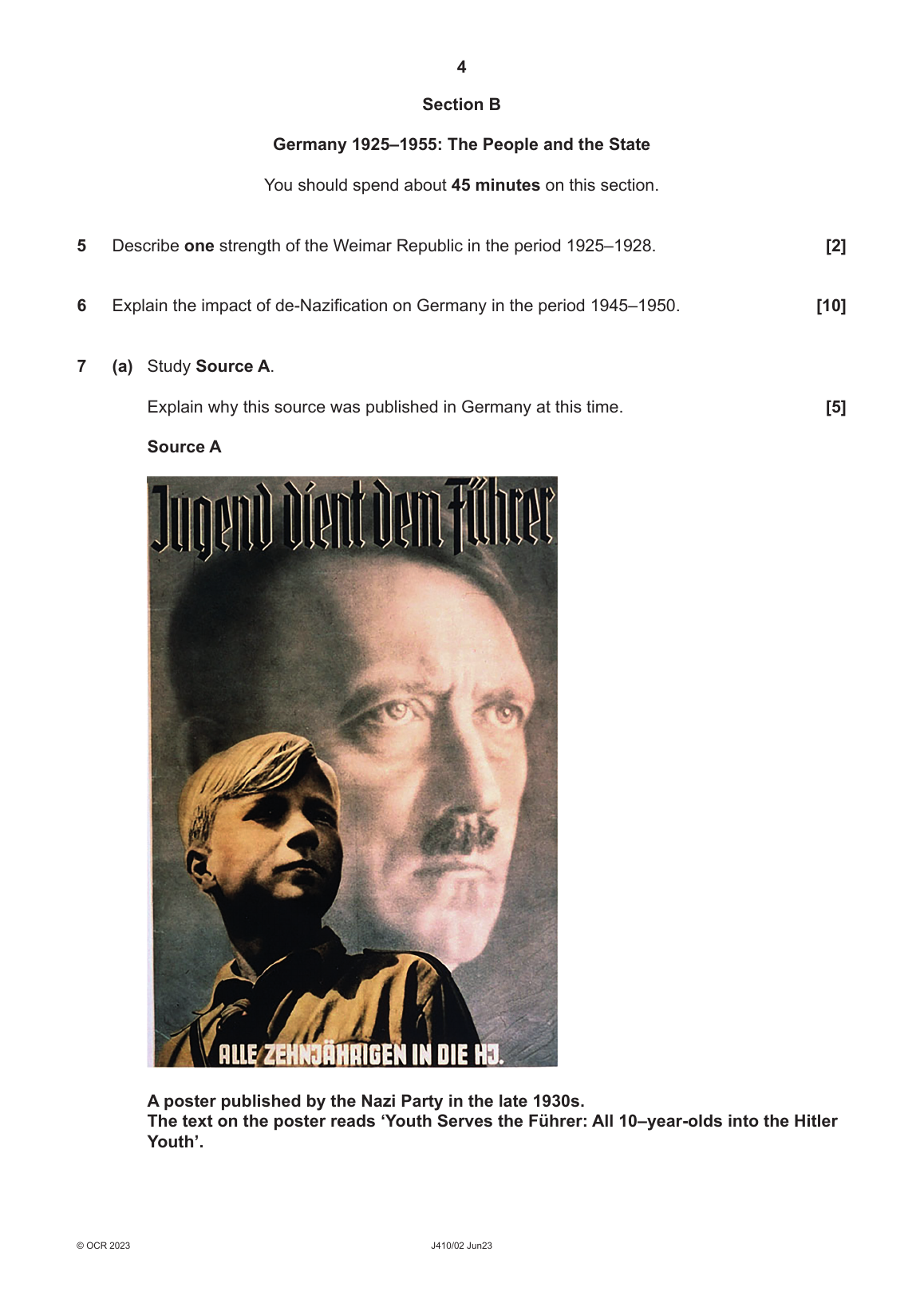 OCR GCSE HISTORY A PAPER 2 QUESTION PAPER 2023 (J410/02: International Relations: the changing international order 1918âc.1975 with Germany 1925â1955: The People and the State). DOWNLOAD OFFICIAL AND VERIFIED OCR GCSE HISTORY A PAPER 2 QUESTION PAPER 2023 ON www.leakedexams.com.
