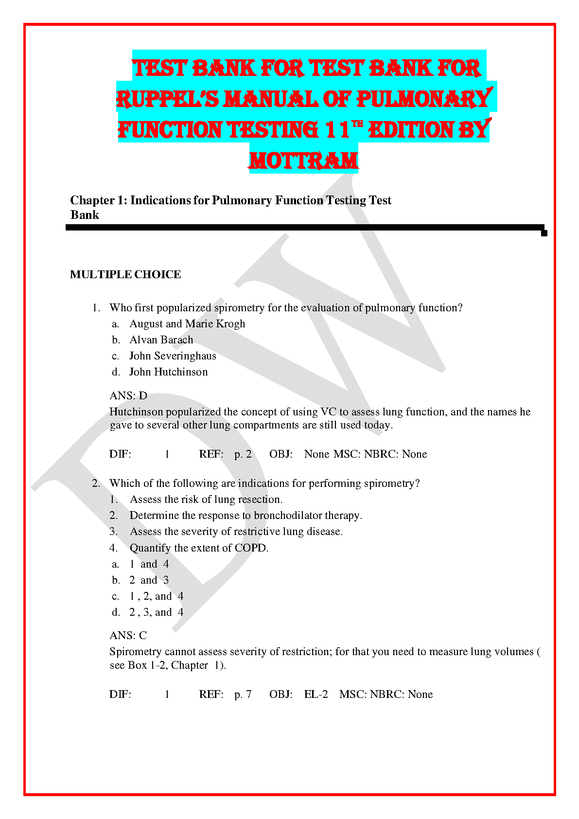 TEST BANK for Ruppel's Manual of Pulmonary Function Testing 112th Edition by Carl Mottram