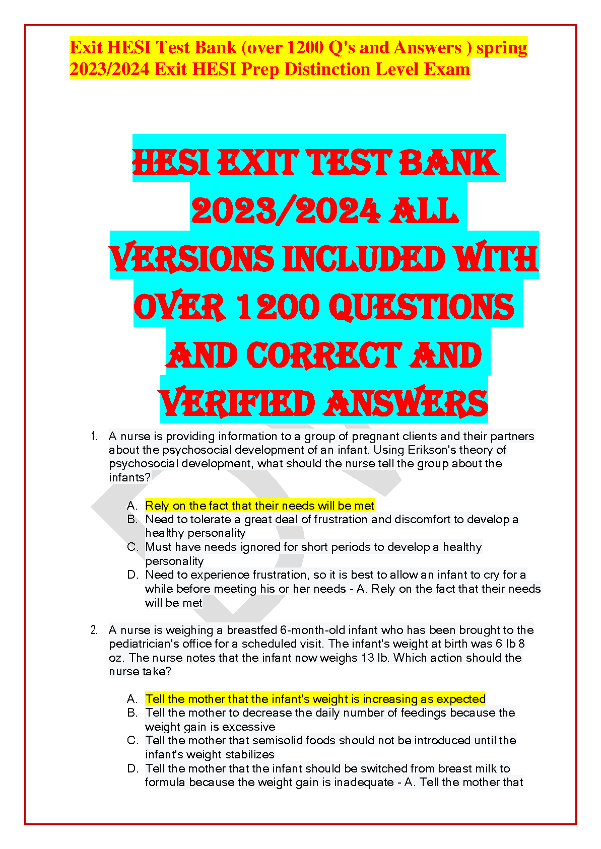 2024 HESI EXIT TEST BANK 2024 ALL VERSIONS INCLUDED WITH OVER 1200 QUESTIONS AND CORRECT AND VERIFIED ANSWERS