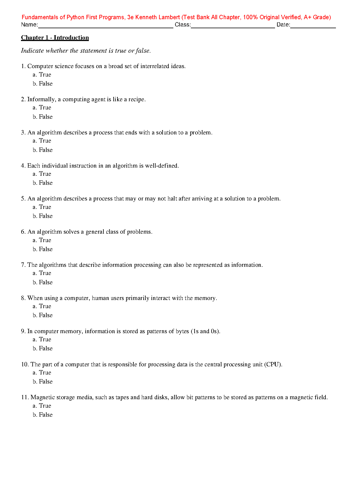 Test Bank for Fundamentals of Python: First Programs, 3rd Edition by by Kenneth A. Lambert