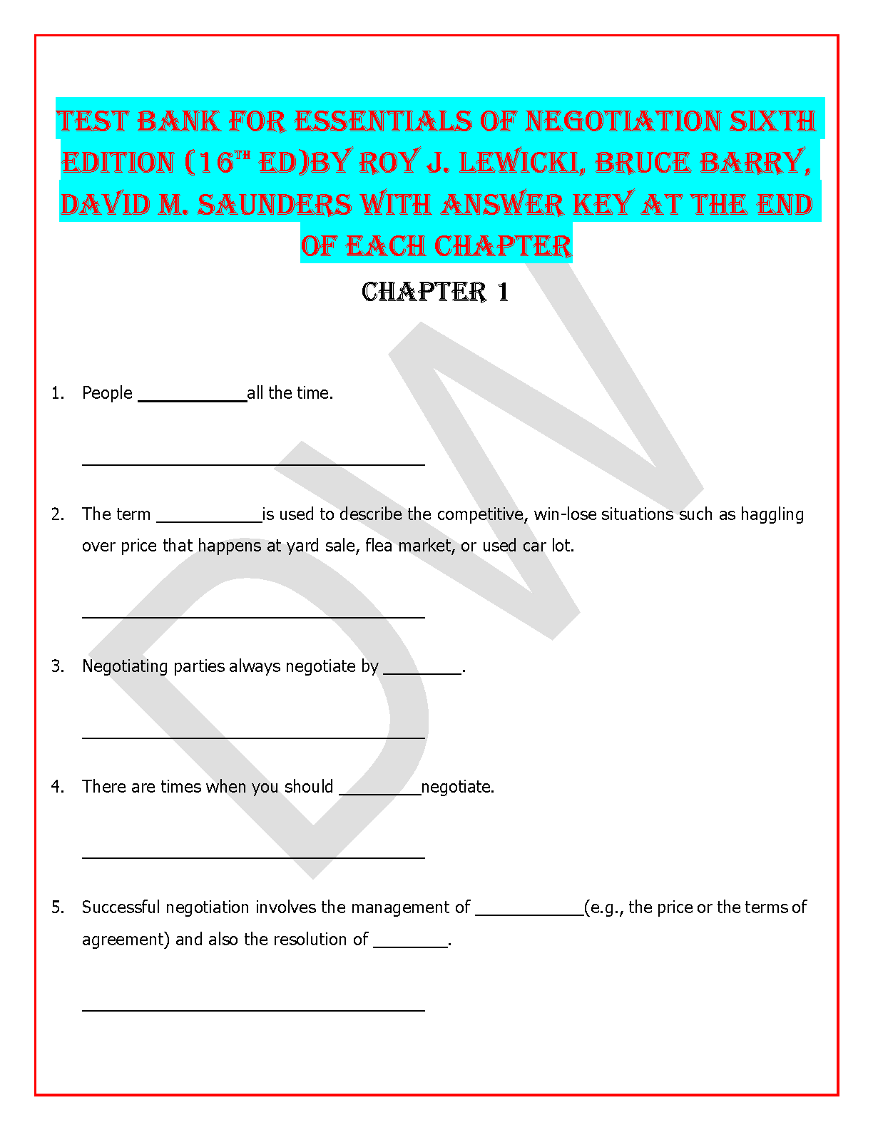 TEST BANK FOR ESSENTIALS OF NEGOTIATION 16TH EDITION BY ROY J. LEWICKI, BRUCE BARRY, DAVID M. SAUNDERS