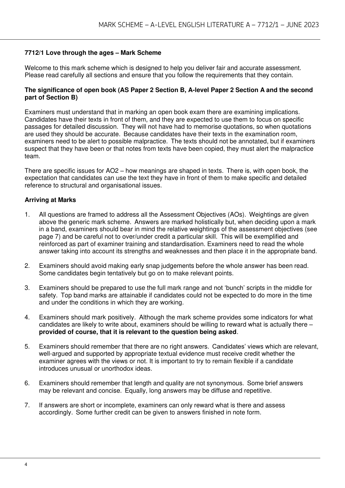 AQA A LEVEL ENGLISH LITERATURE A MARKSCHEME PAPER 1 (7712/1; Love through the ages)
