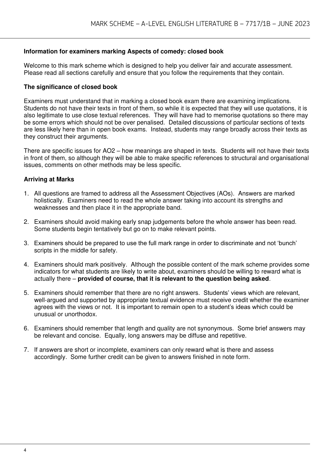 AQA A LEVEL ENGLISH LITERATURE B MARKSCHEME PAPER 1B 2023 (7717/1B; Literary genres: Aspects of Comedy)