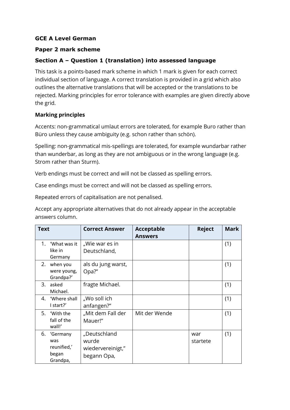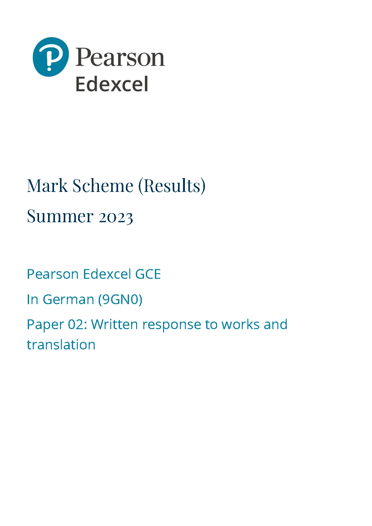 PEARSON EDEXCEL GCE GERMAN MARKSCHEME PAPER 2 2023 (9GNO/02:Written response to works and translation)