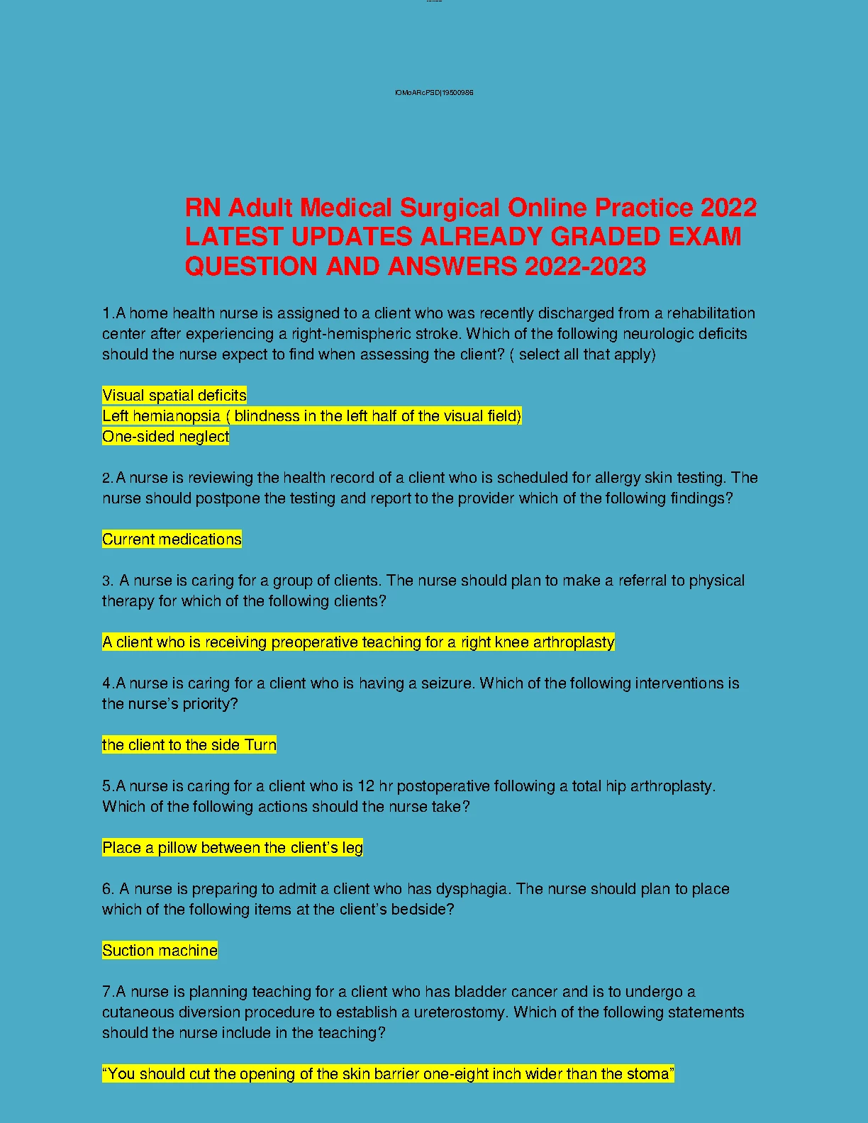 RN Adult Medical Surgical Online Practice ALREADY GRADED EXAM QUESTION AND ANSWERS UPDATED FOR 2024. DOWNLOAD on www.leakedexams.com INSTANTLY.