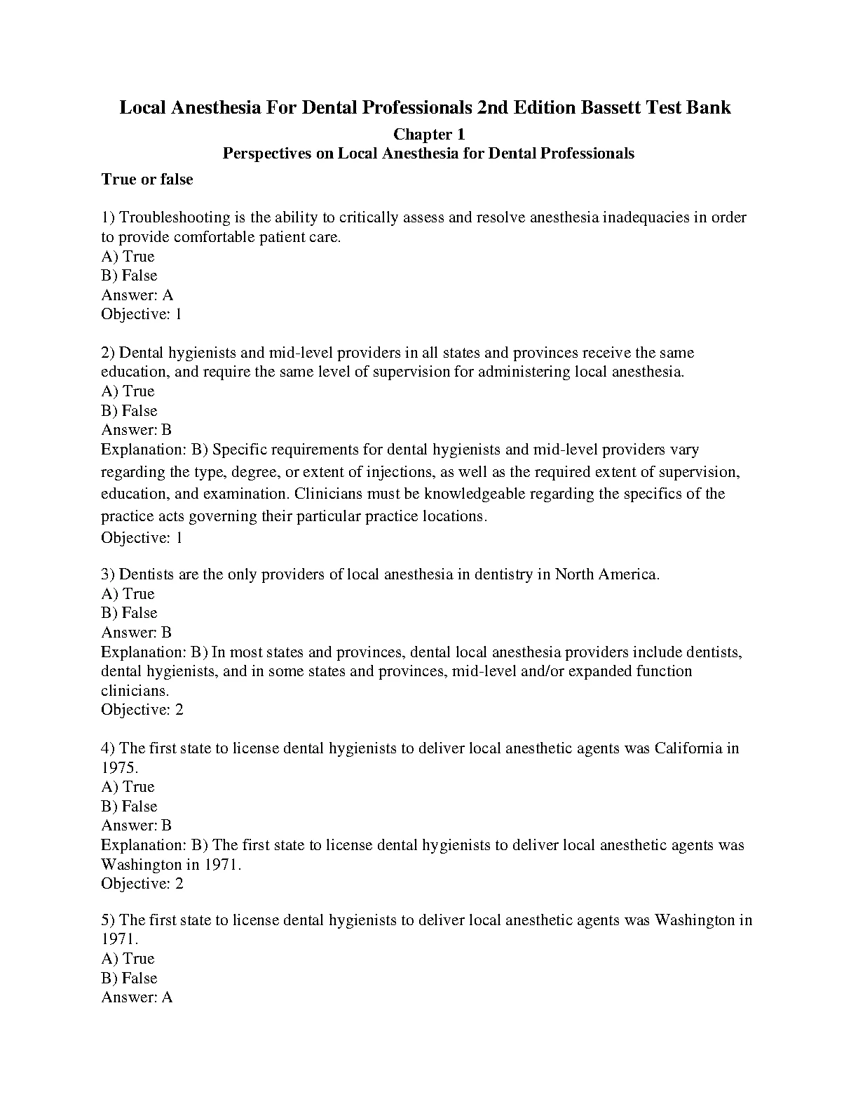 TEST BANK Local Anesthesia For Dental Professionals 2nd Edition Bassett
