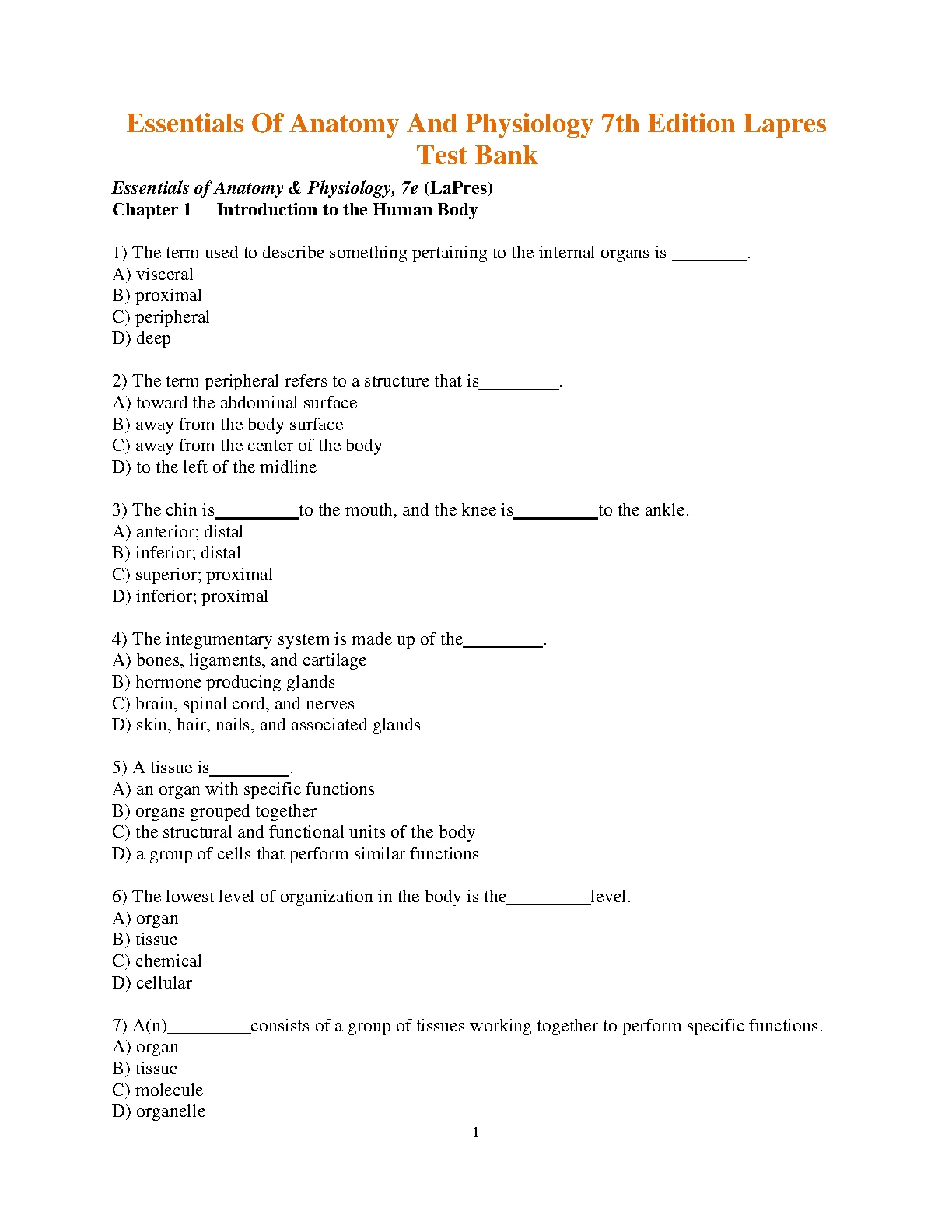 TEST BANK Essentials Of Anatomy And Physiology 7th Edition Lapres