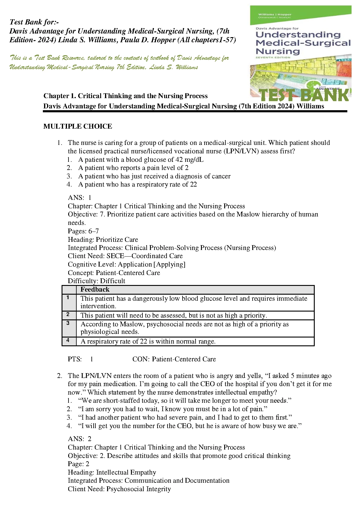 Test Bank for:- Davis Advantage for Understanding Medical-Surgical Nursing, (7th Edition- 2024) Linda S. Williams, Paula D. Hopper (All chapters1-57). DOWNLOAD on www.leakedexams.com INSTANTLY.