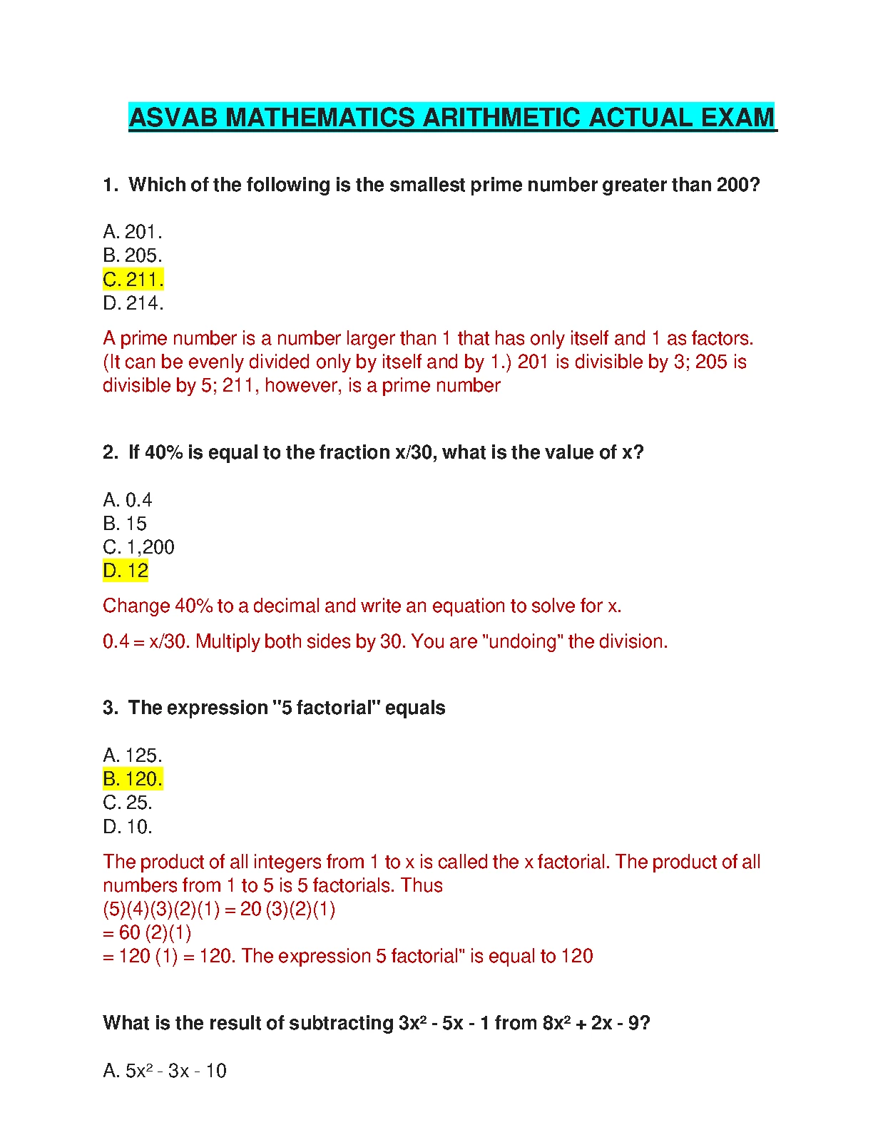 ASVAB MATHEMATICS ARITHMETIC ACTUAL EXAM QUESTIONS AND ANSWERS 2024