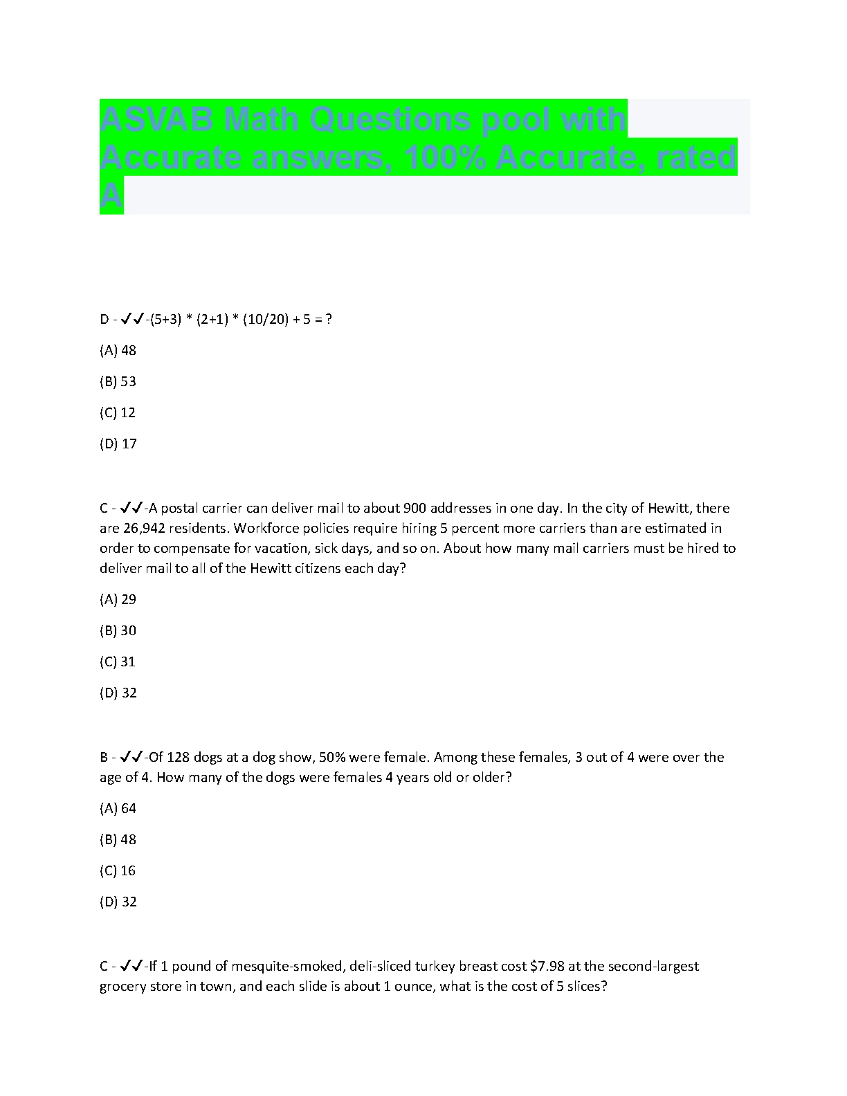 ASVAB MATH POOL QUESTIONS WITH ACCURATE ANSWERS RATED A 2024ASVAB MATH POOL QUESTIONS WITH ACCURATE ANSWERS RATED A 2024