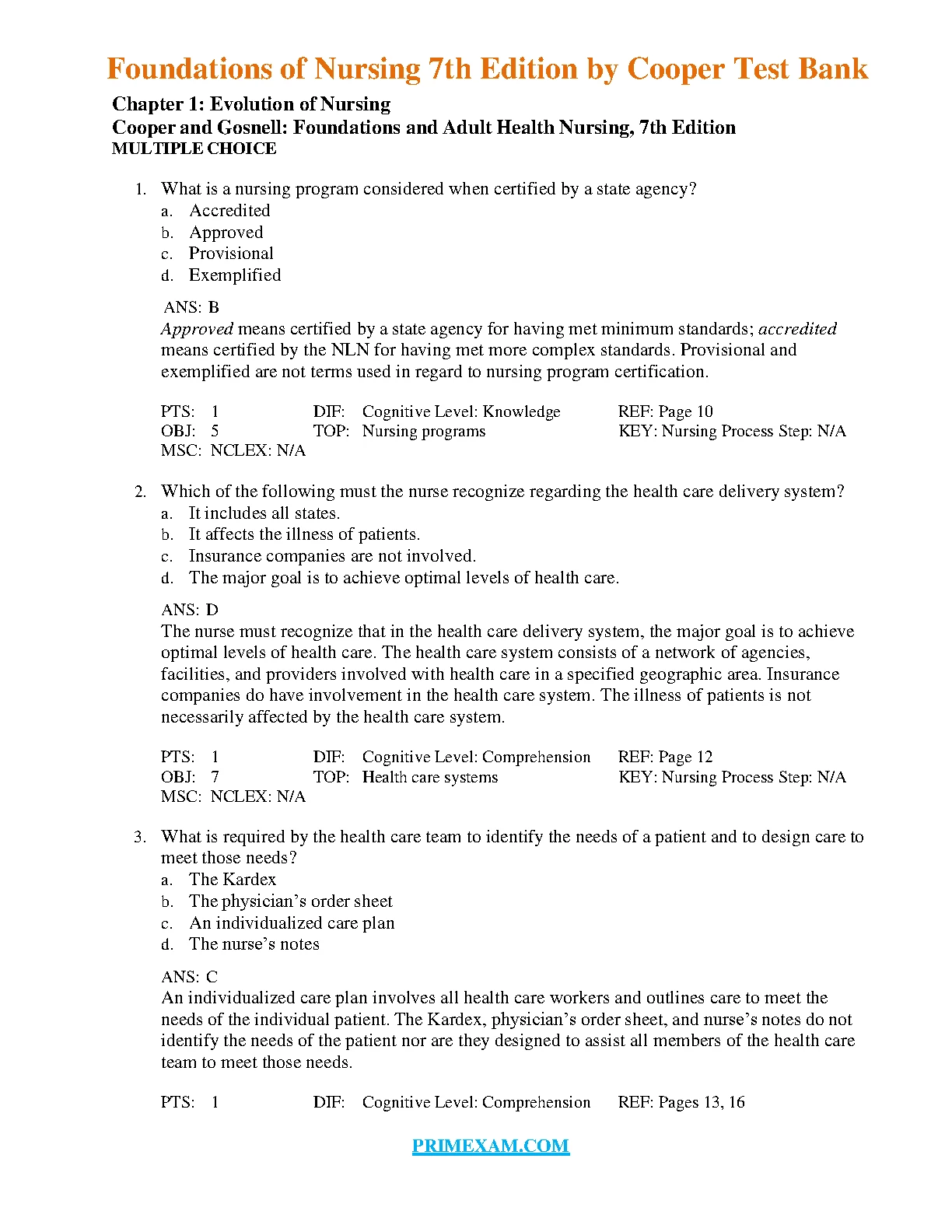 Test Bank: Foundations and Adult Health Nursing, 7th Edition BY Cooper and Gosnell
