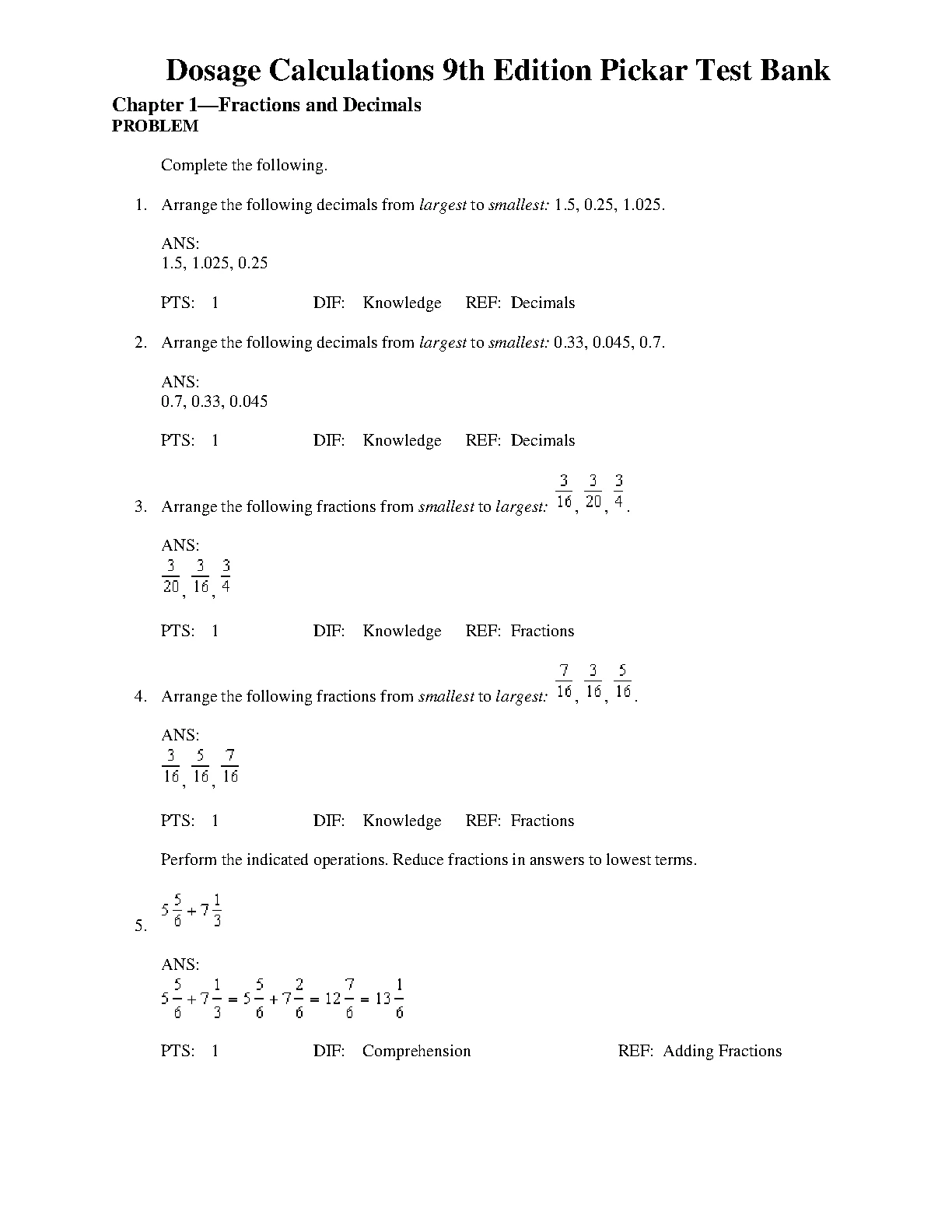 Dosage Calculations 9th Edition Pickar Test Bank