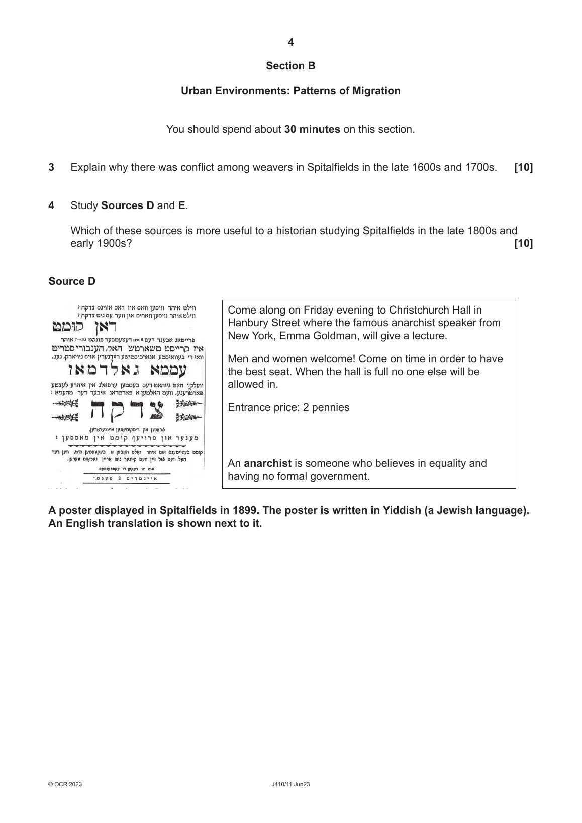 0CR GCSE HISTORY A QUESTION PAPER 11 2023 (J410/11: The Impact of Empire on Britain 1688–c.1730 with Urban Environments: Patterns of Migration)