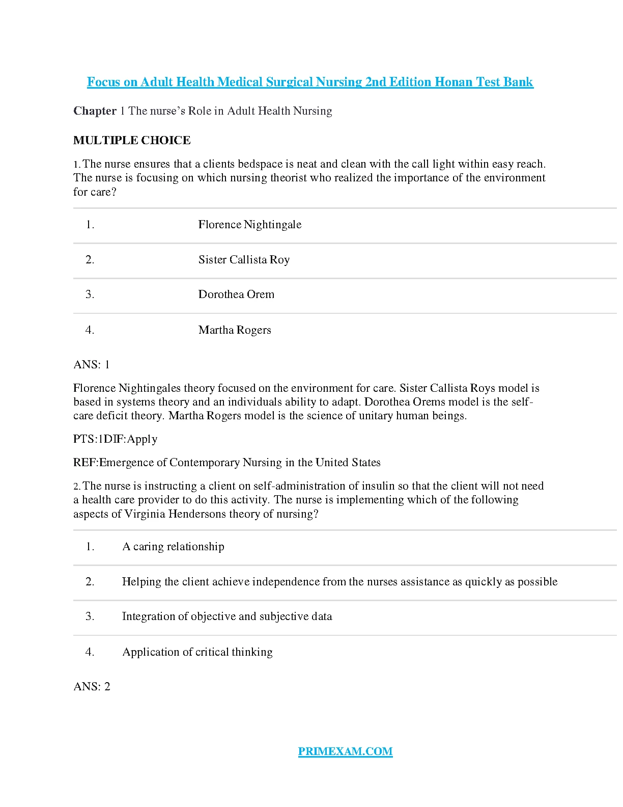 Test bank for Focus on ADULT health medical surgical nursing 2nd edition by Honan