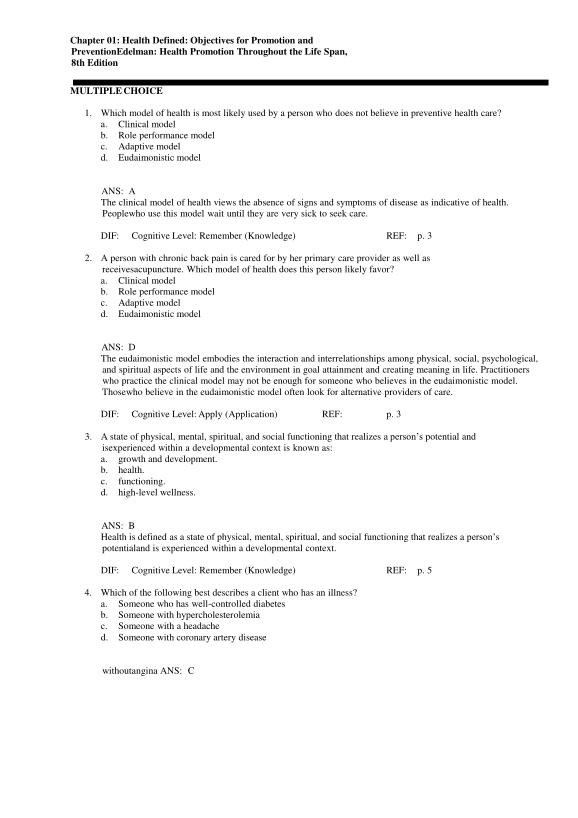Test bank for Health Promotion Throughout the Life Span, 8th Edition by Edelman