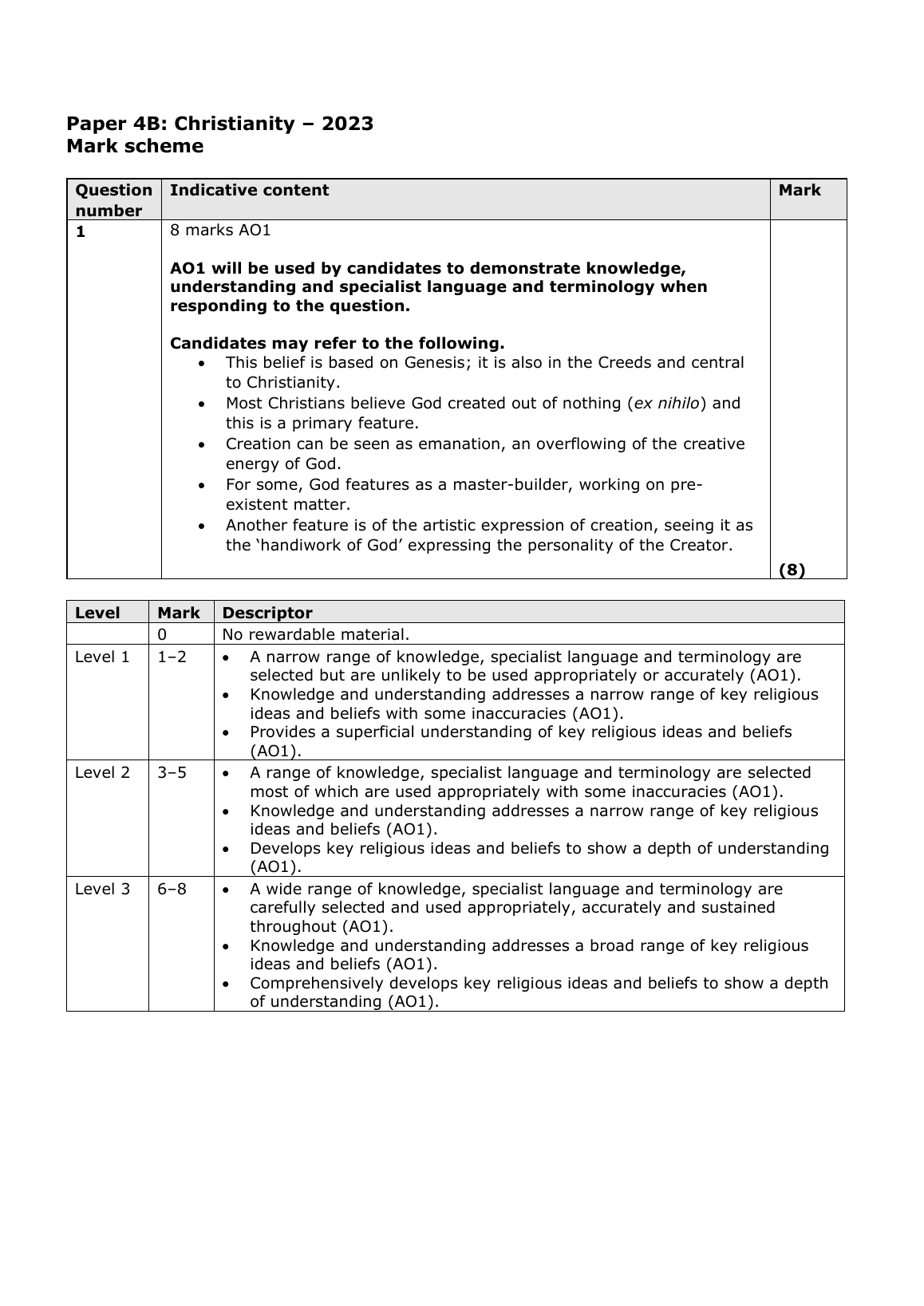 PEARSON EDEXCEL A LEVEL RELIGIOUS STUDIES MARK SCHEME PAPER 4B 2023 (9RS0/4B:Christianity)