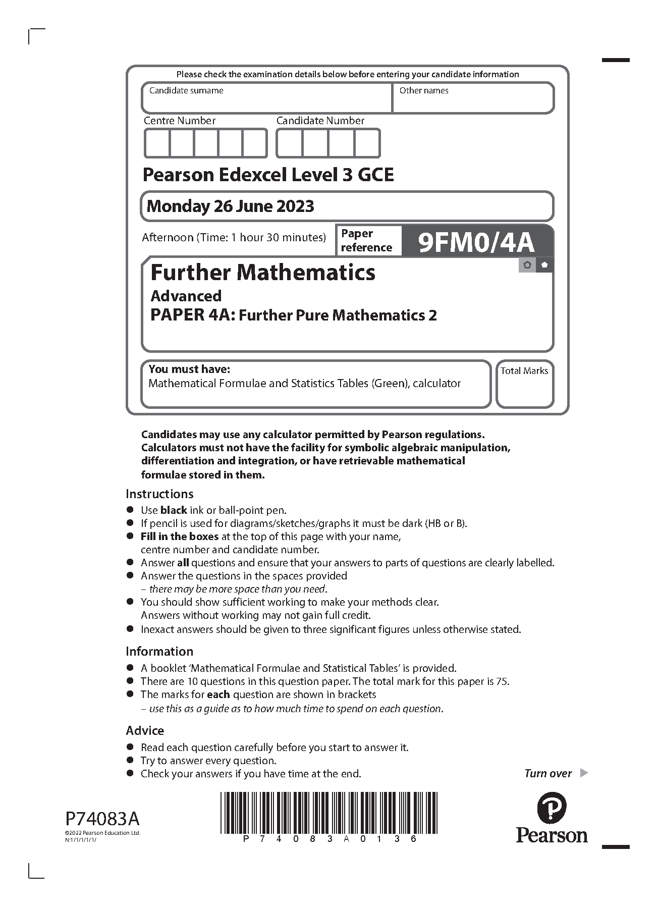 PEARSON EDEXCEL A LEVEL FURTHER MATHEMATICS QUESTION PAPER 4A 2023 (9FM0/4A:Further Pure Mathematics 2)