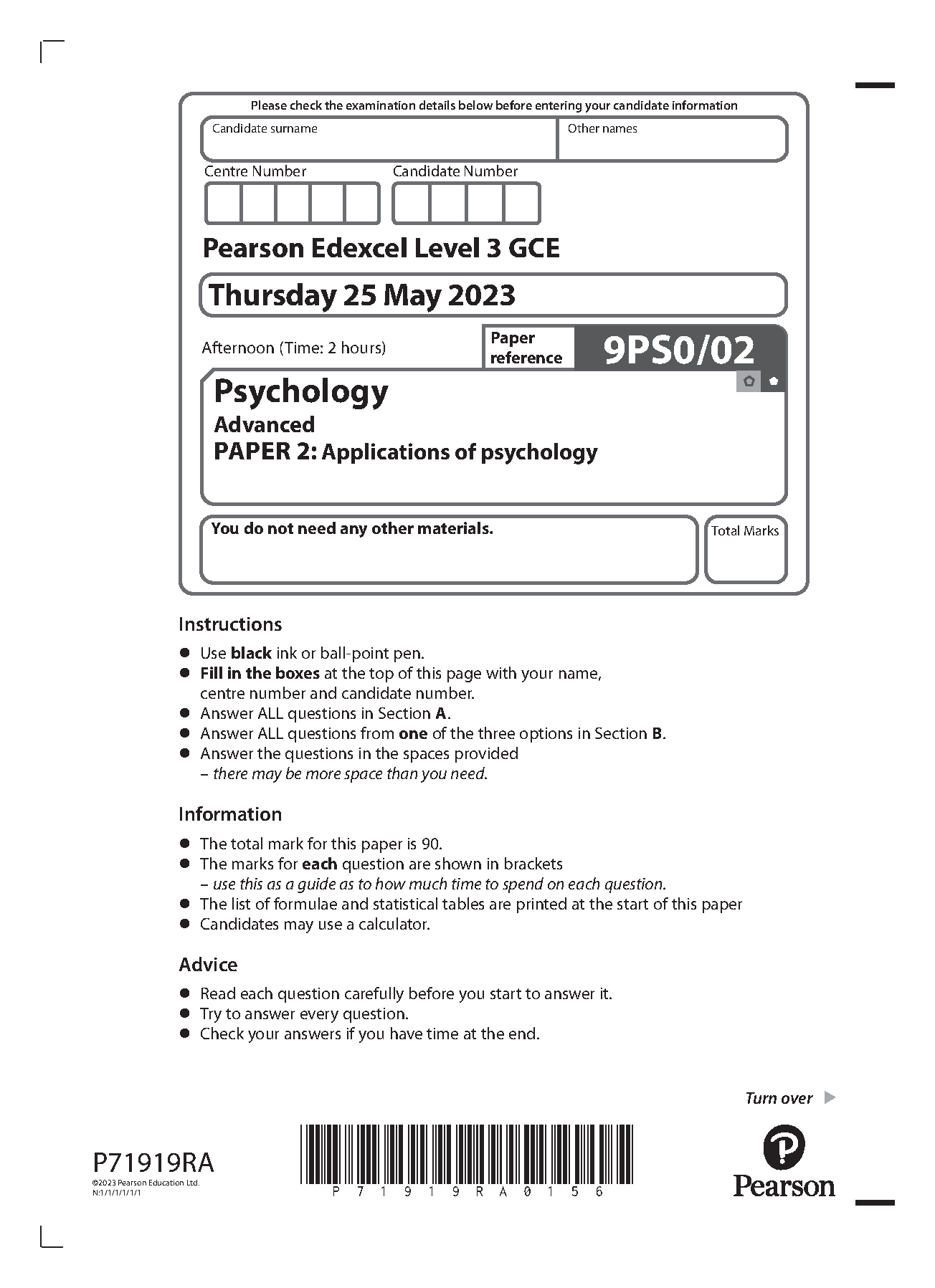 PEARSON EDEXCEL A LEVEL PSYCHOLOGY PAPER 2 2023 (9PS0/02:Foundations in Psychology)