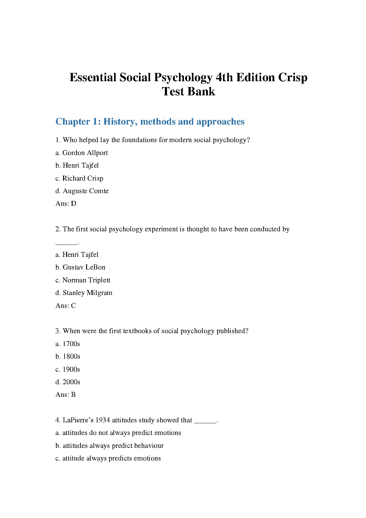 Test Bank For Essential Social Psychology 4th Edition by Richard J. Crisp and  Rhiannon Turner .