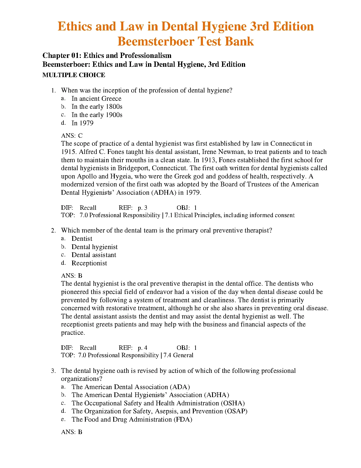 Test Bank For Ethics and Law in Dental Hygiene 3rd Edition by Phyllis L. Beemsterboer
