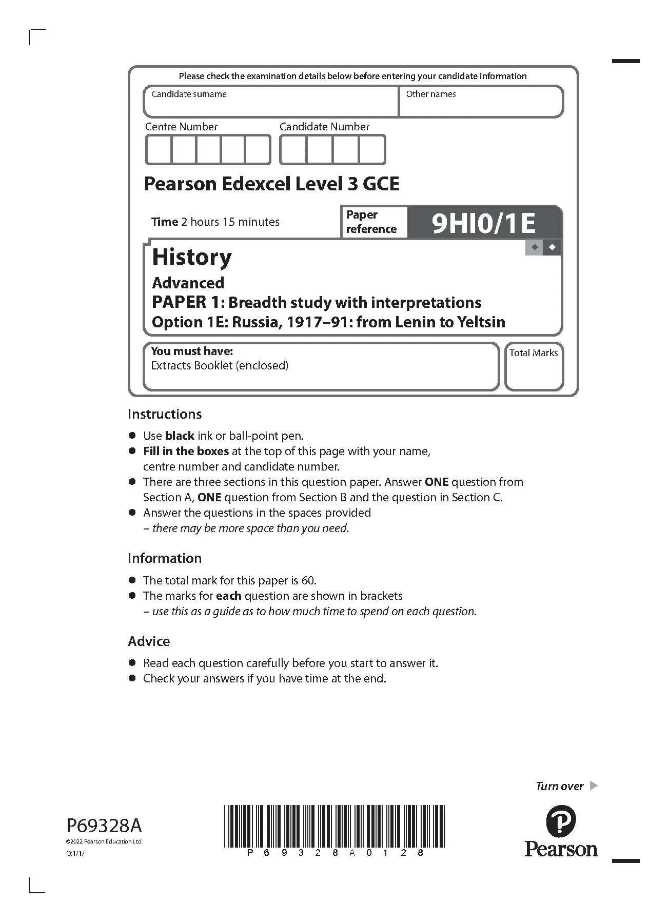 PEARSON EDEXCEL A LEVEL PAPER 1 HISTORY LEVEL 3 QUESTION PAPER 2023 (9HI0/1E: Breadth study with interpretations Option 1E: Russia, 1917â91: from Lenin to Yeltsin)Â Â