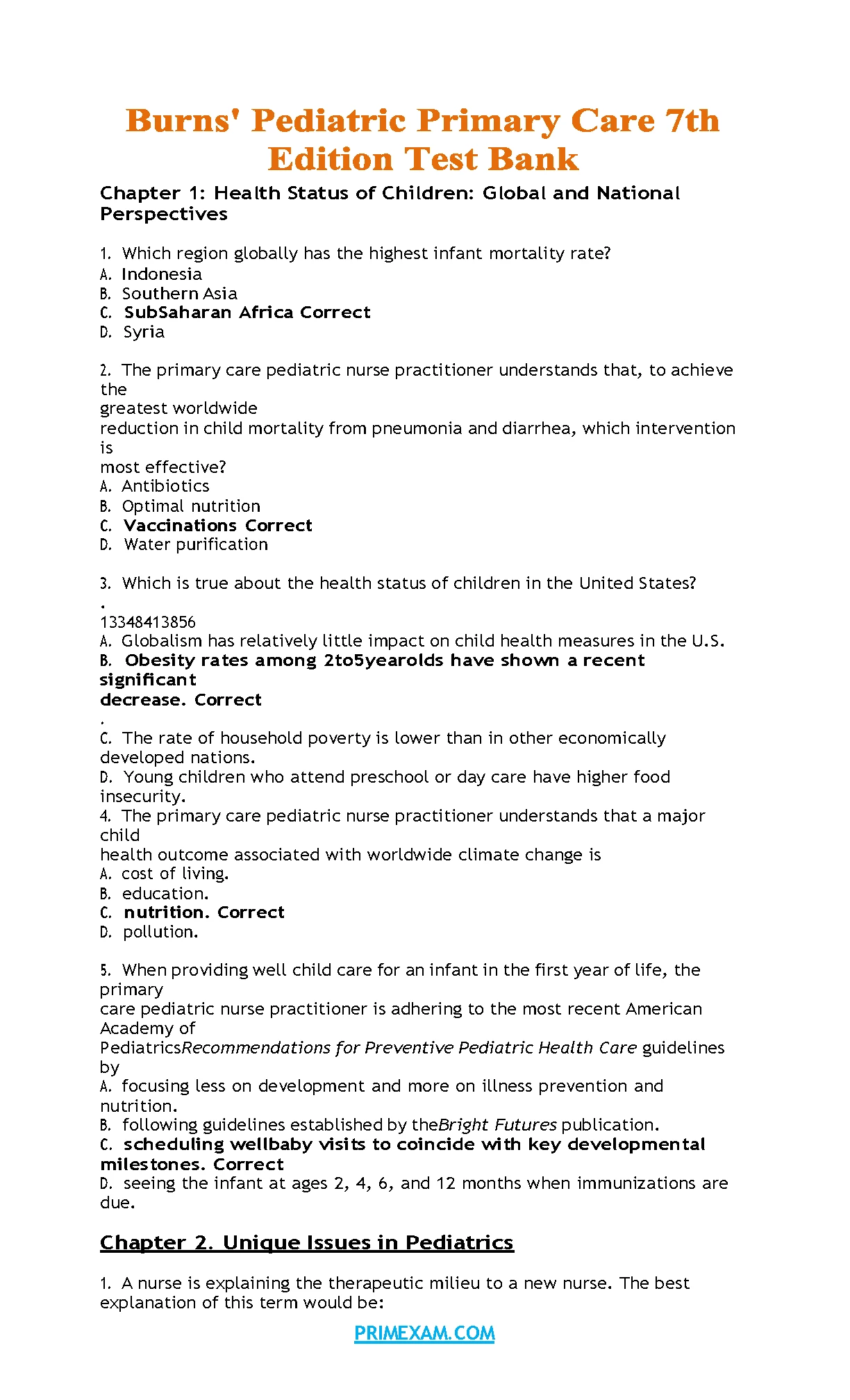 TEST BANK FOR BURN'S PEDIATRIC PRIMARY CARE 7TH EDITION BY Dawn Lee Garzon, Nancy Barber Starr, Nan M. Gaylord, Martha Driessnack, Nan M. Gaylord and Karen G...