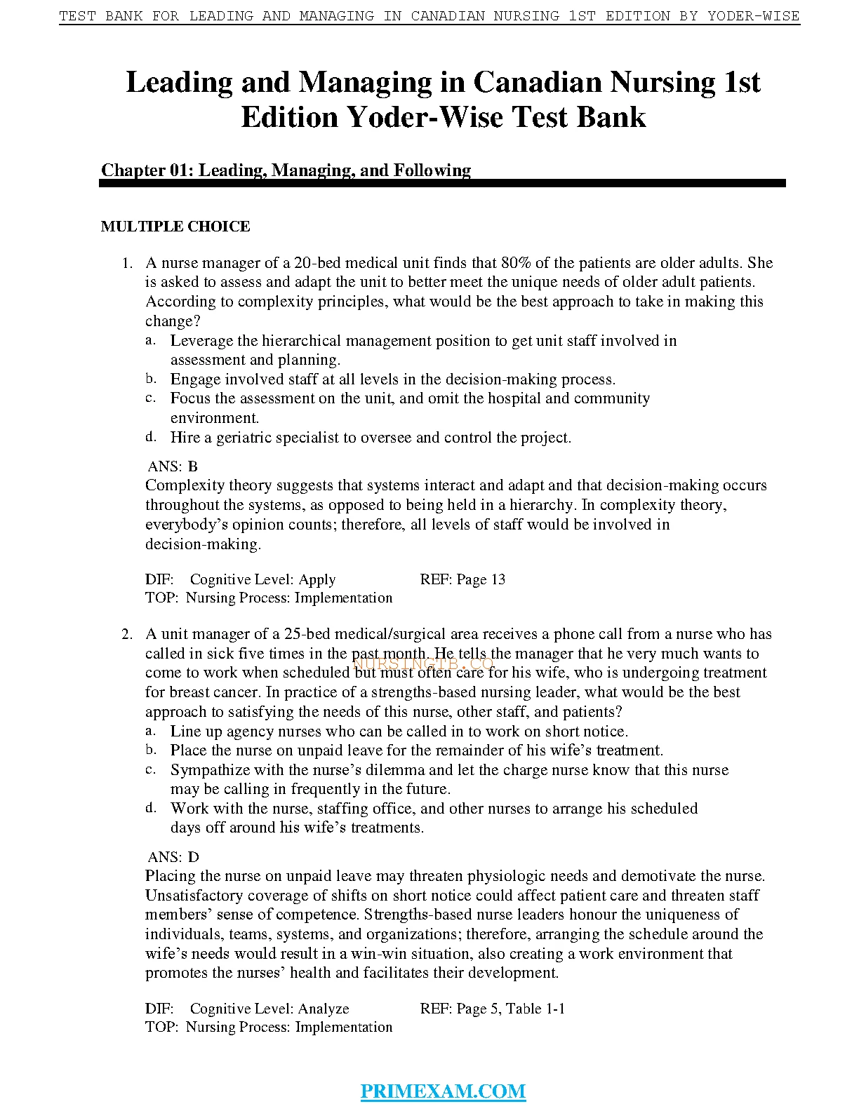 Test Bank For Leading and Managing in Canadian Nursing 1st Edition by RN Yoder-Wise, Patricia S. and RN Grant, Lyle G