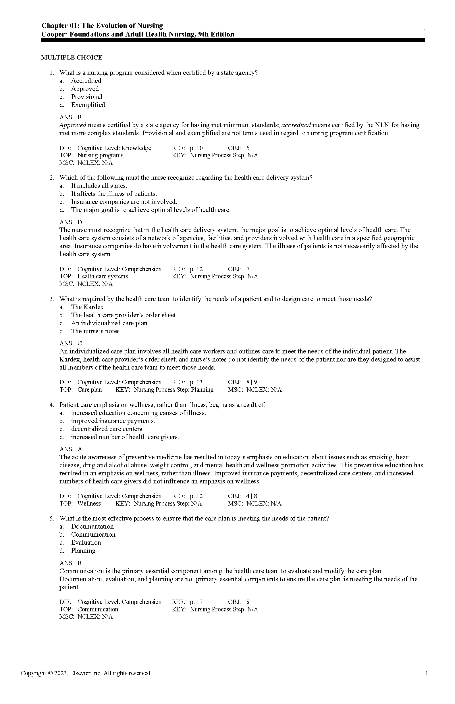 Test Bank: Foundations and Adult Health Nursing, 9th Edition by Kim Cooper, Kelly Gosnell
