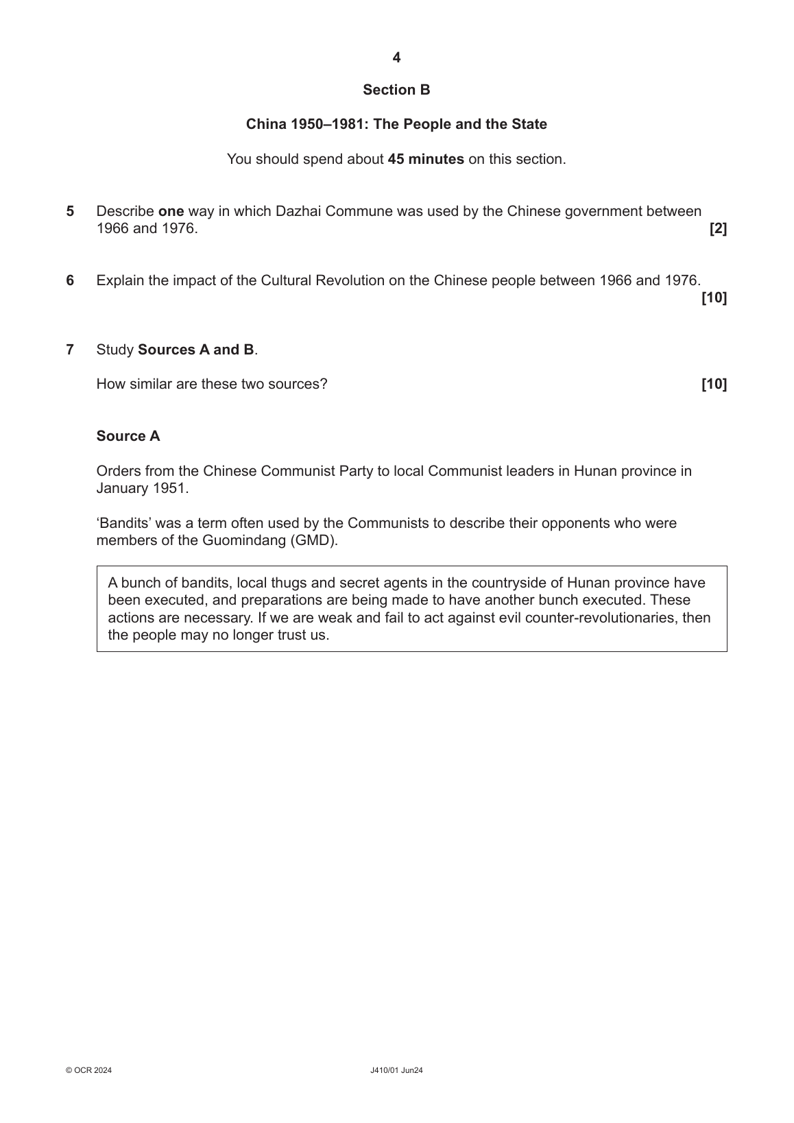 2024 OCR GCSE History A Paper 1 (J410/01 :International Relations: the changing international order 1918–1975 with China 1950–1981: The People and the State)