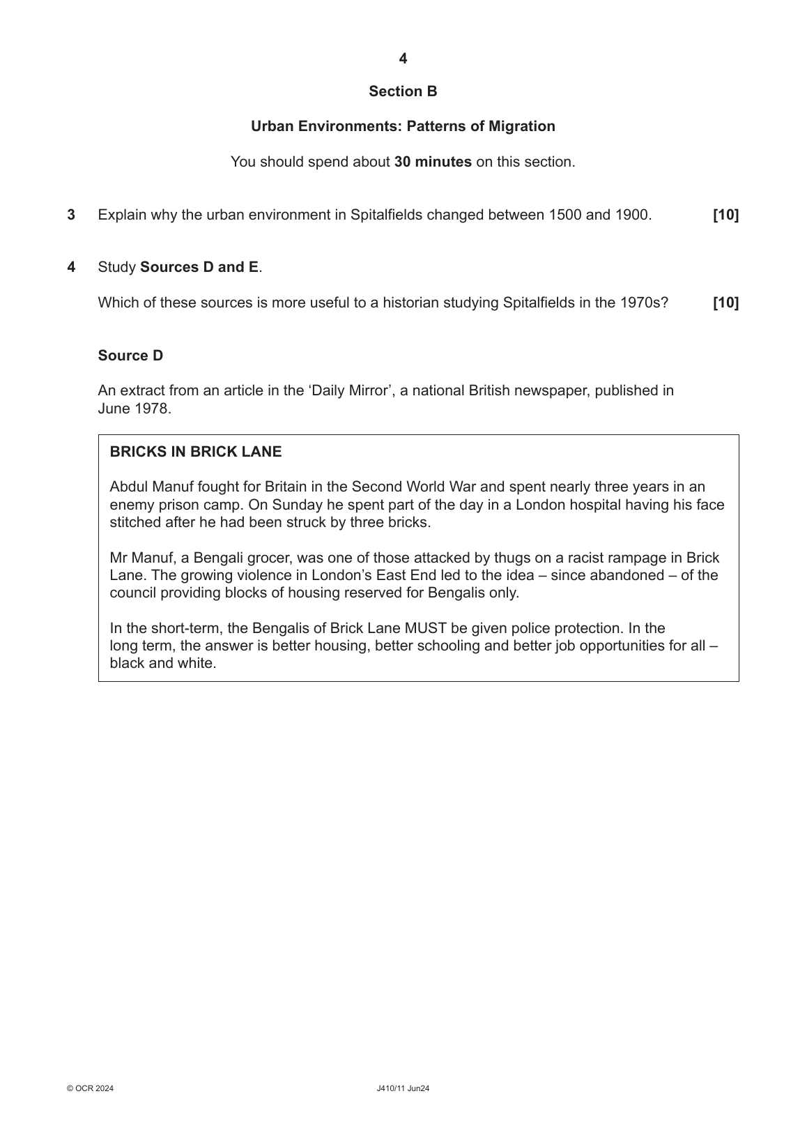 2024 OCR GCSE History A Paper 11 (J410/11: The Impact of Empire on Britain 1688–c.1730 with Urban Environments: Patterns of Migration)