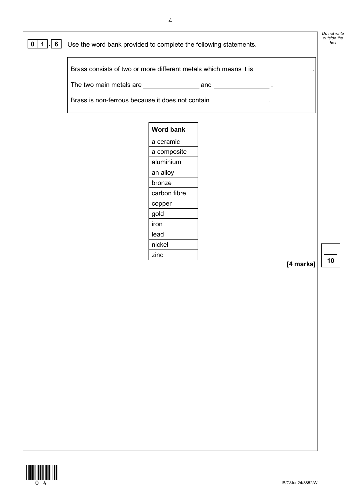 2024 AQA GCSE ENGINEERING UNIT 1 MARK SCHEME (8852/W: UNIT 1)