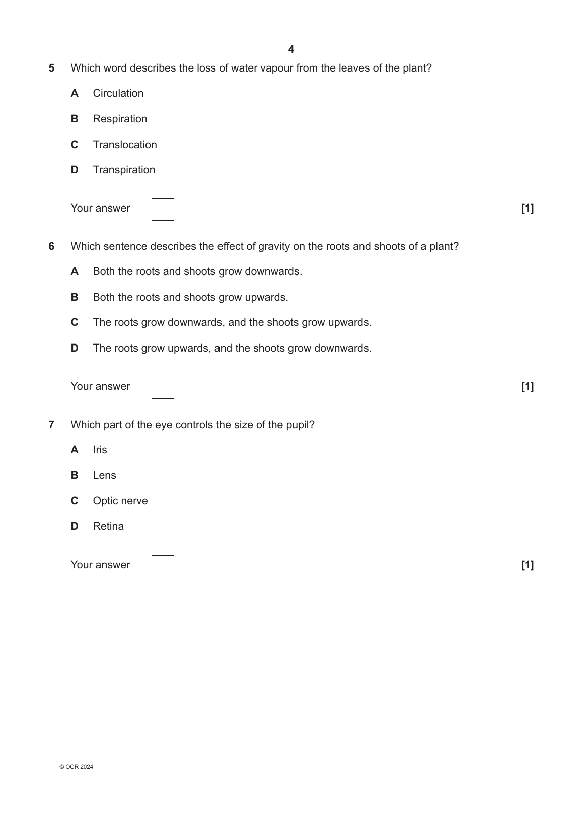 OCR GCSE BIOLOGY A QUESTION PAPER 1 2024 (J247/01: Foundation Tier)