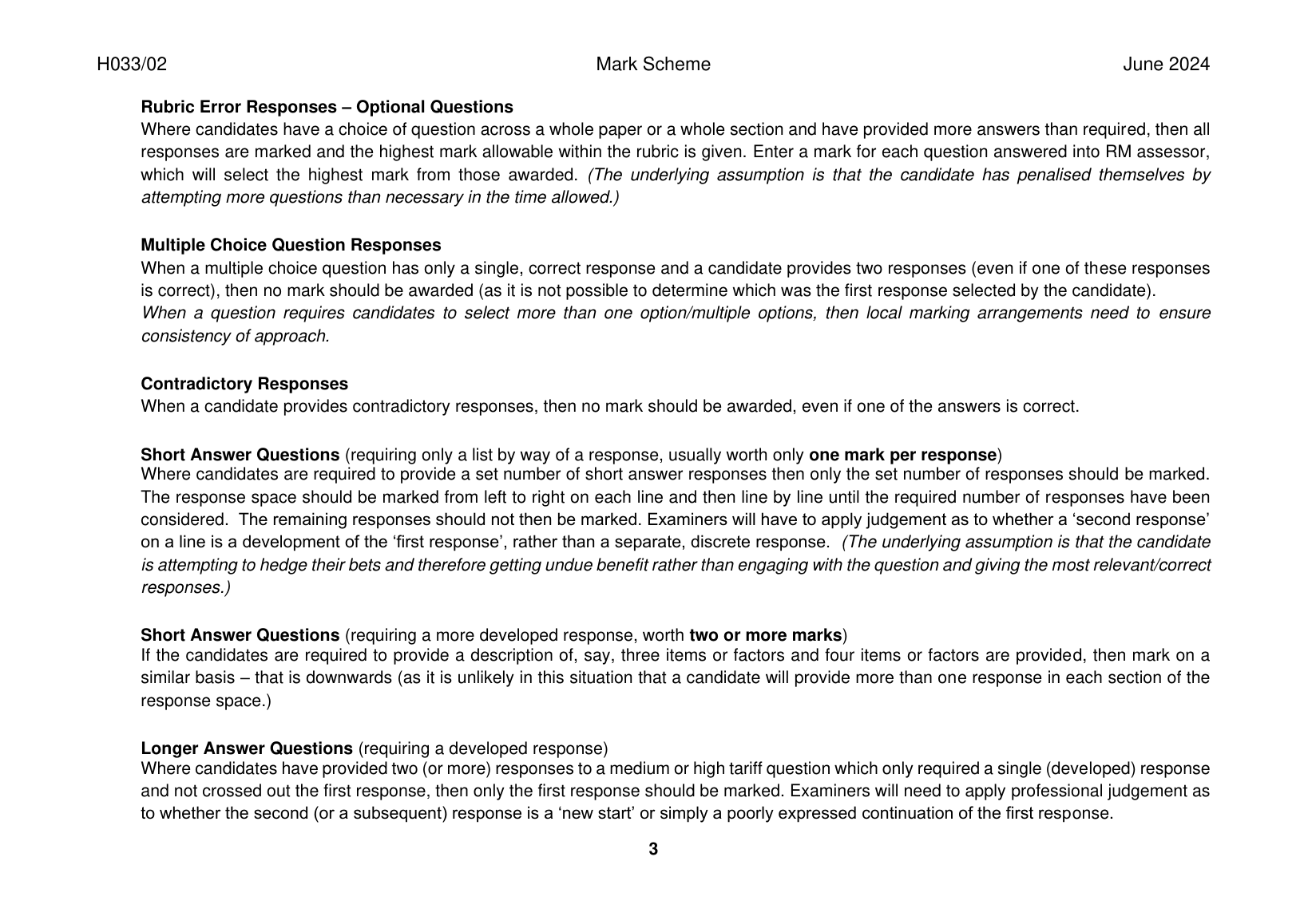 OCR GCE CHEMISTRY B AS LEVEL MARK SCHEME 2024(H033/02:CHEMISTRY IN DEPTH)