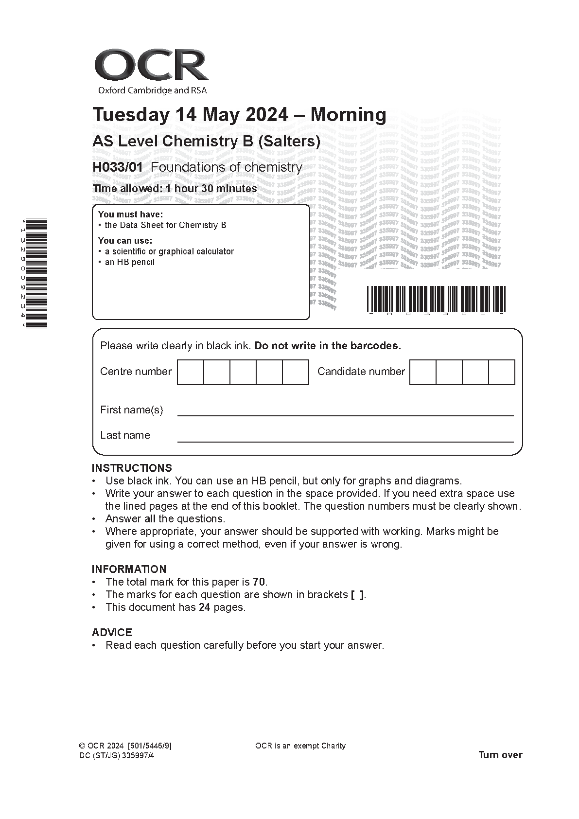 OCR AS LEVEL CHEMISTRY B(SALTERS) PAPER 1 2024(H033/01:FOUNDATIONS OF CHEMISTRY)