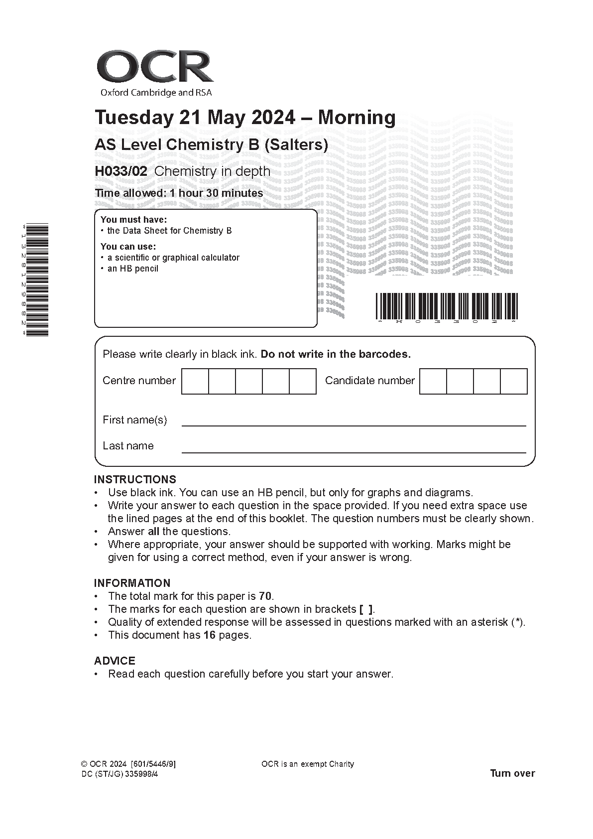 OCR AS LEVEL CHEMISTRY B(SALTERS) QUESTION PAPER 1 2024(H033/02:CHEMISTRY IN DEPTH).DOWNLOAD THE OFFICIAL AND VERIFIED PAPER ON www.leakedexams.com INSTANTLY