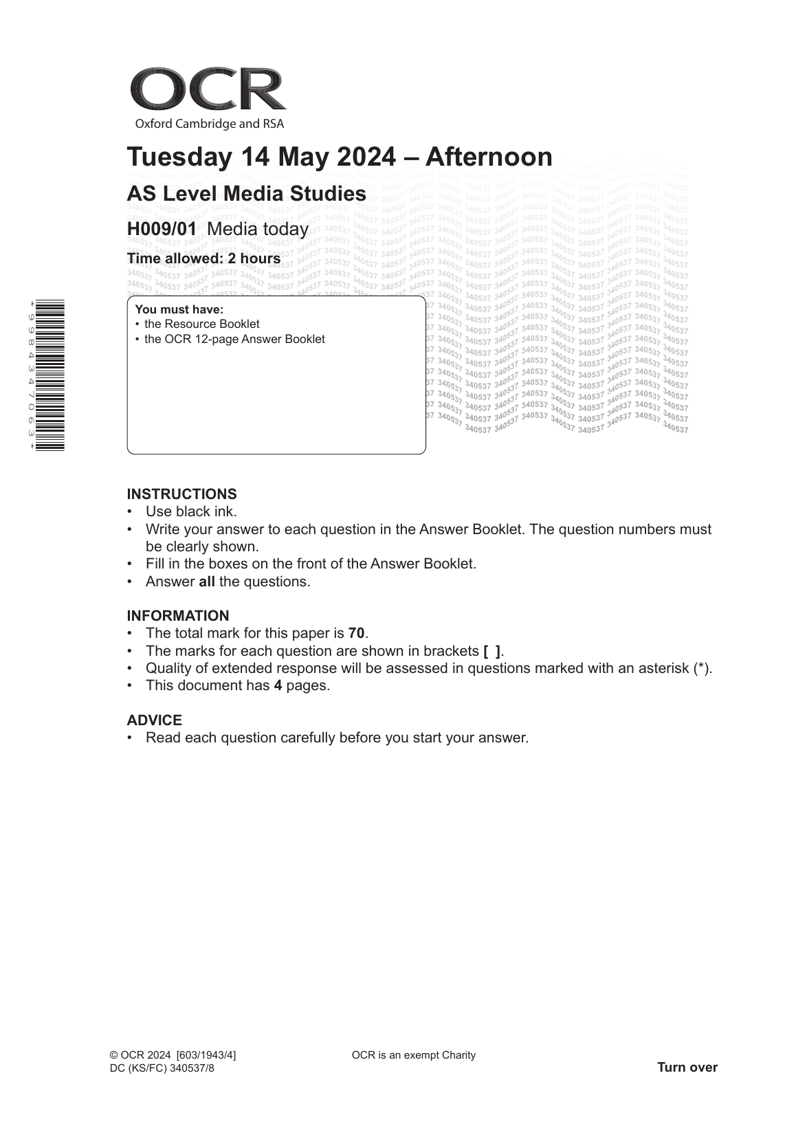 OCR AS LEVEL MEDIA STUDIES QUESTION PAPER 1 2024(H009/01:MEDIA TODAY)