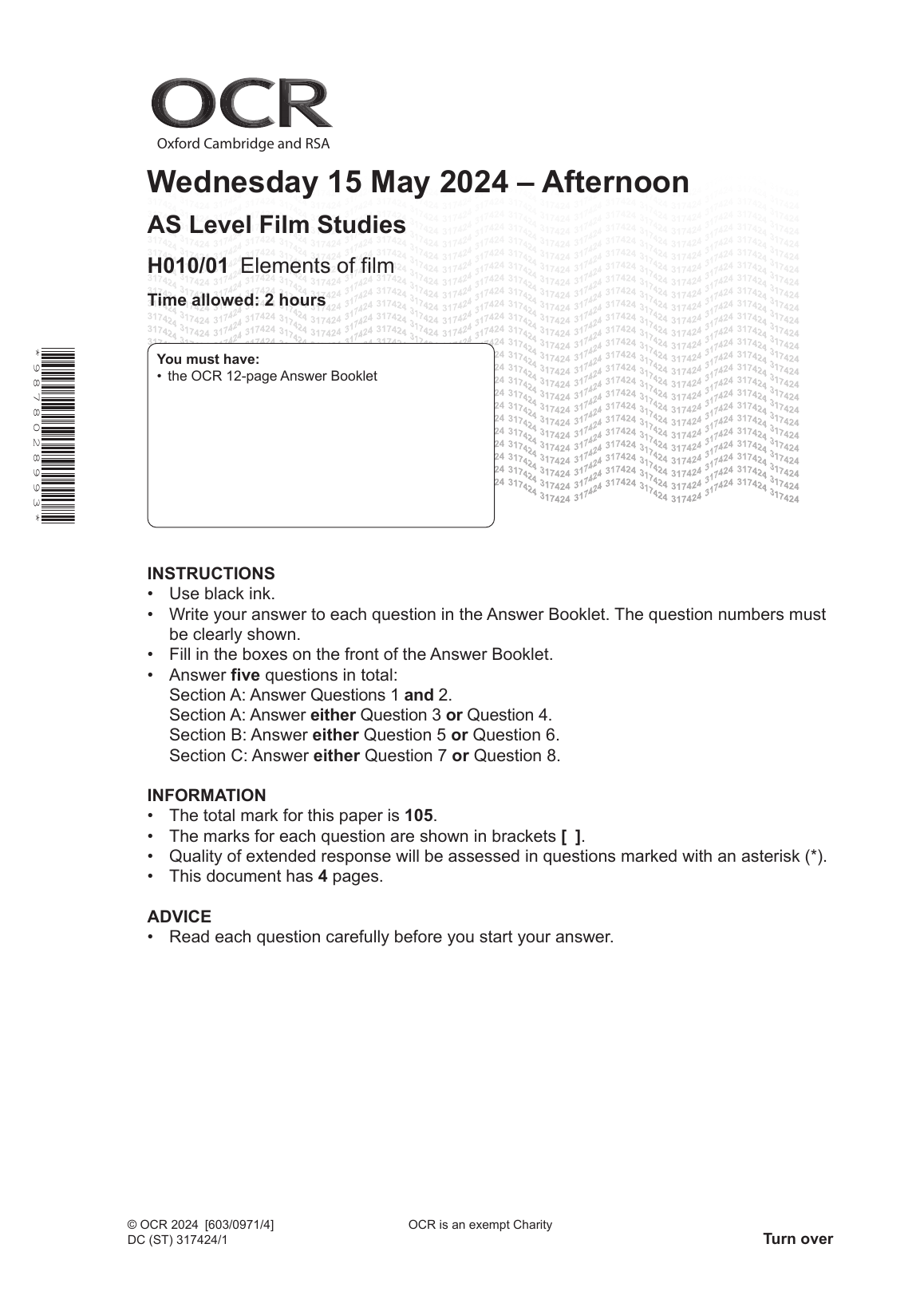 OCR AS LEVEL FILM STUDIES QUESTION PAPER 2024(H010/01:ELEMENTS OF FILM)