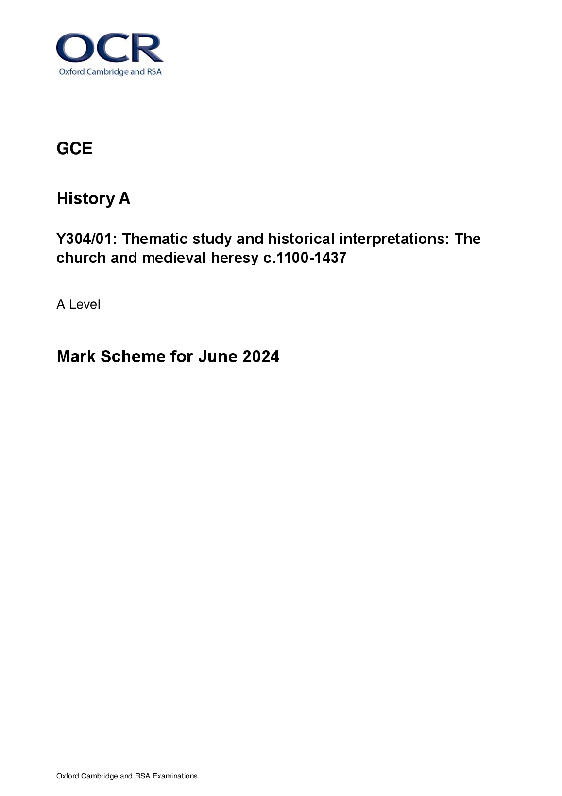 OCR A LEVEL HISTORY A PAPER 1 MARK SCHEME 2024 (Y304/01: Thematic study and historical interpretations: The church and medieval heresy c.1100-1437). DOWNLOAD THE OFFICIAL AND VERIFIED PAPER ON www.Leakedexams.com INSTANTLY.
