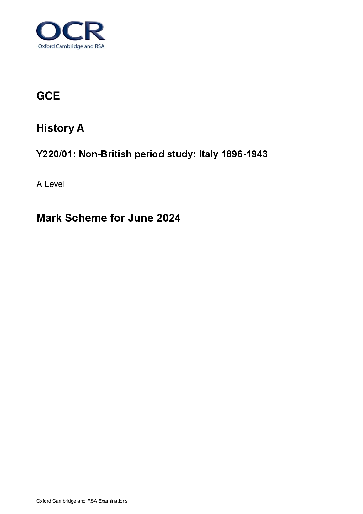 OCR A LEVEL HISTORY A PAPER 1 MARK SCHEME 2024 (Y220/01: Non-British period study: Italy 1896-1943). DOWNLOAD THE OFFICIAL AND VERIFIED PAPER ON www.Leakedexams...