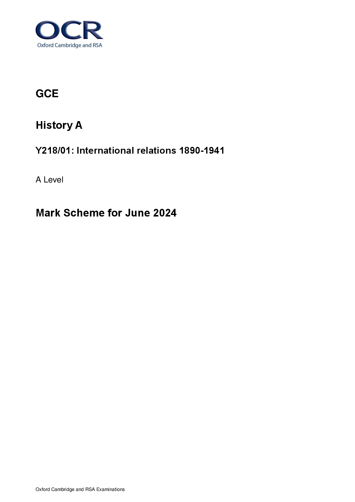 OCR A LEVEL HISTORY A PAPER 1 MARK SCHEME 2024 (Y218/01: International relations 1890-1941)