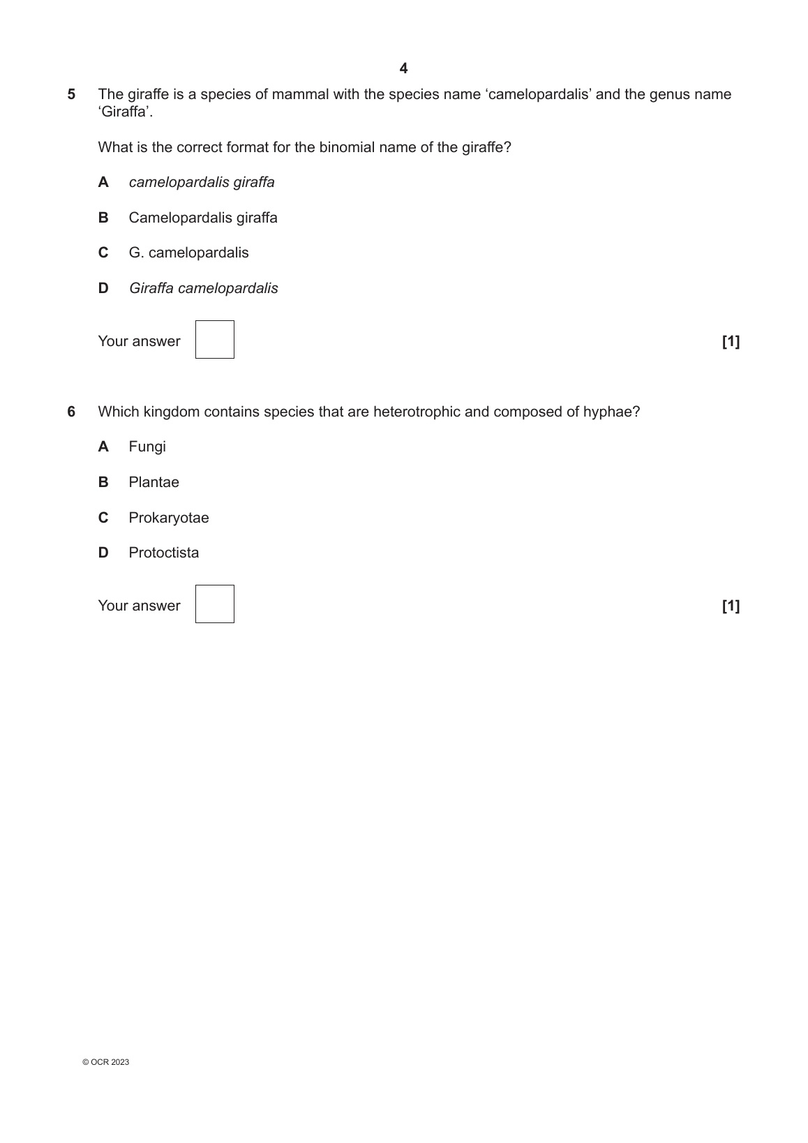OCR GCE A LEVEL BIOLOGY A PAPER 1 MARK SCHEME 2023...