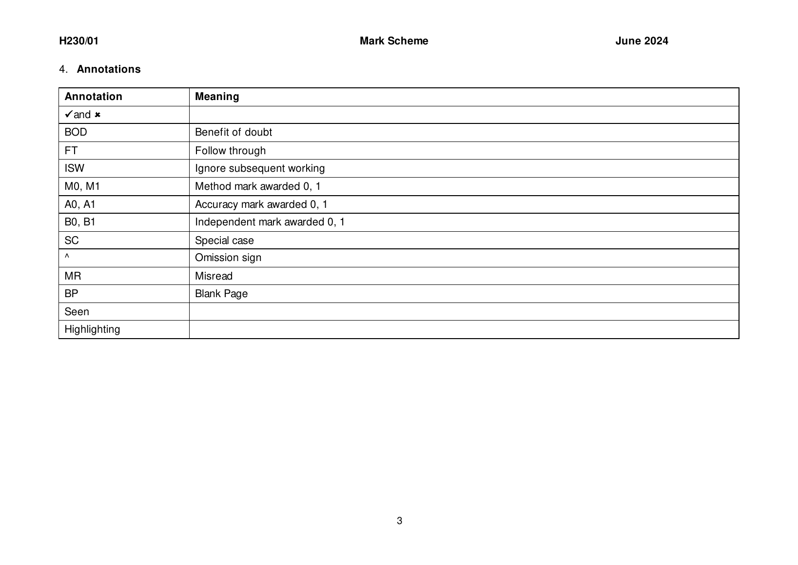 OCR GCE MATHEMATICS A PAPER 1 AS LEVEL MARK SCHEME 2024(H230/01:PURE MATHEMATICS AND STATISTICS)