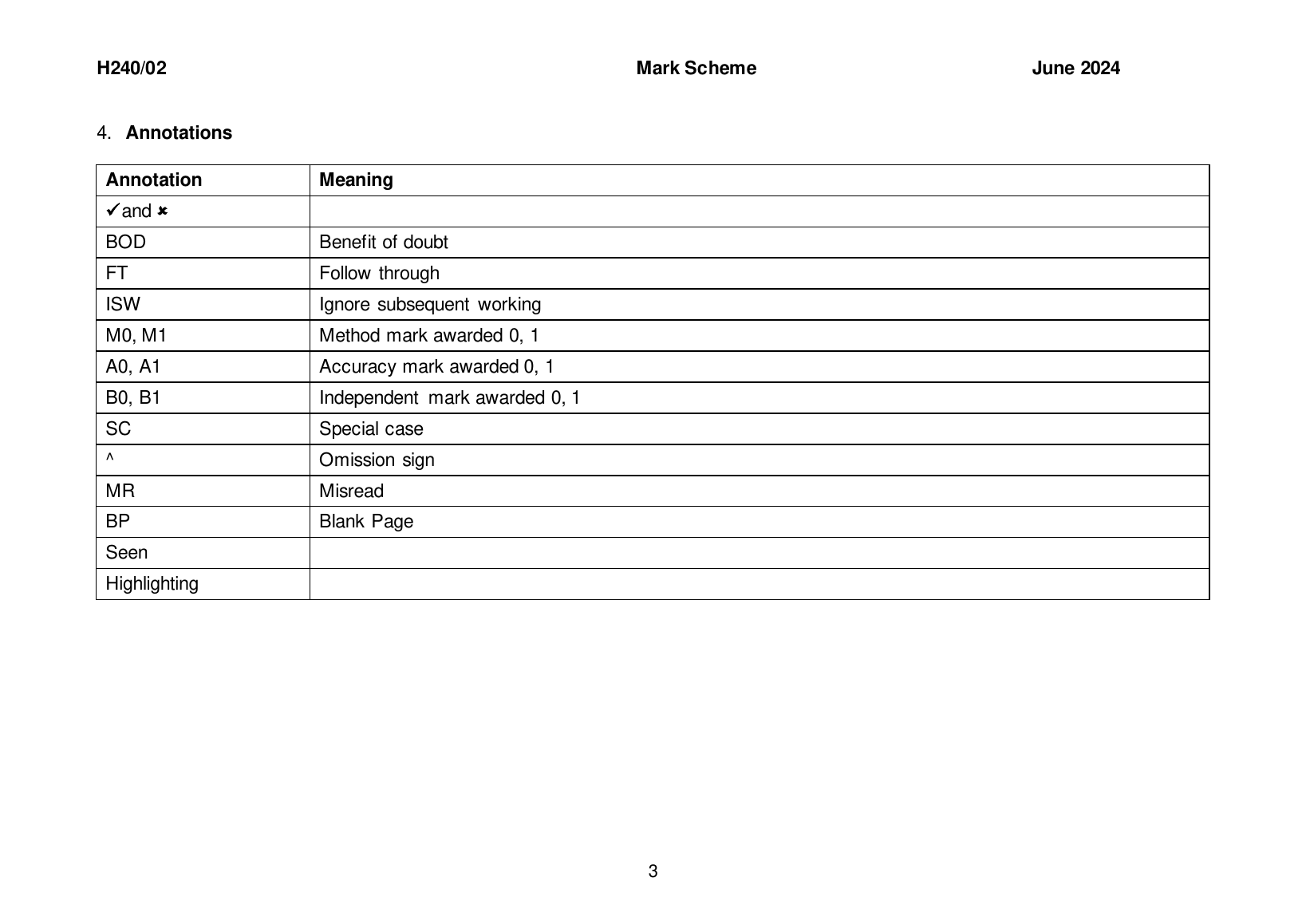 OCR GCE MATHEMATICS A PAPER 2 A LEVEL MARK SCHEME 2024(H240/02:PURE MATHEMATICS AND STATISTICS)