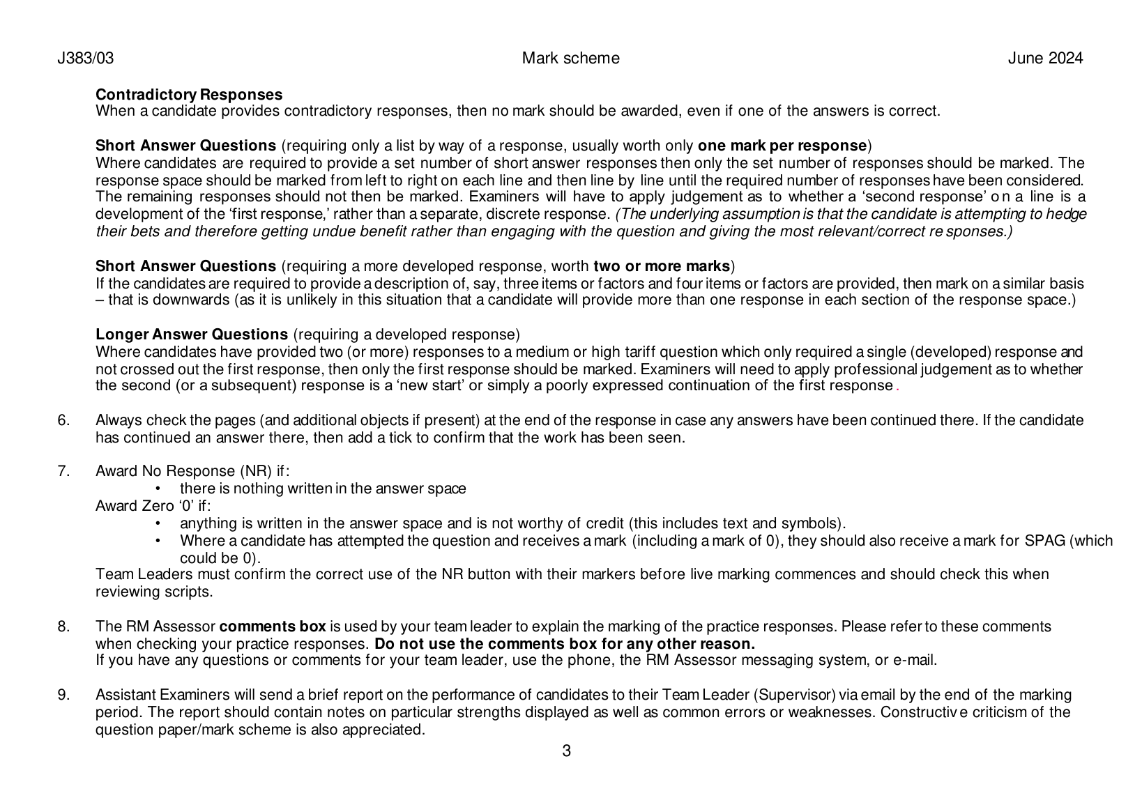 2024 OCR GCSE Geography A Geographical Themes Paper 3 Mark Scheme (J383/03: Geographical skills)